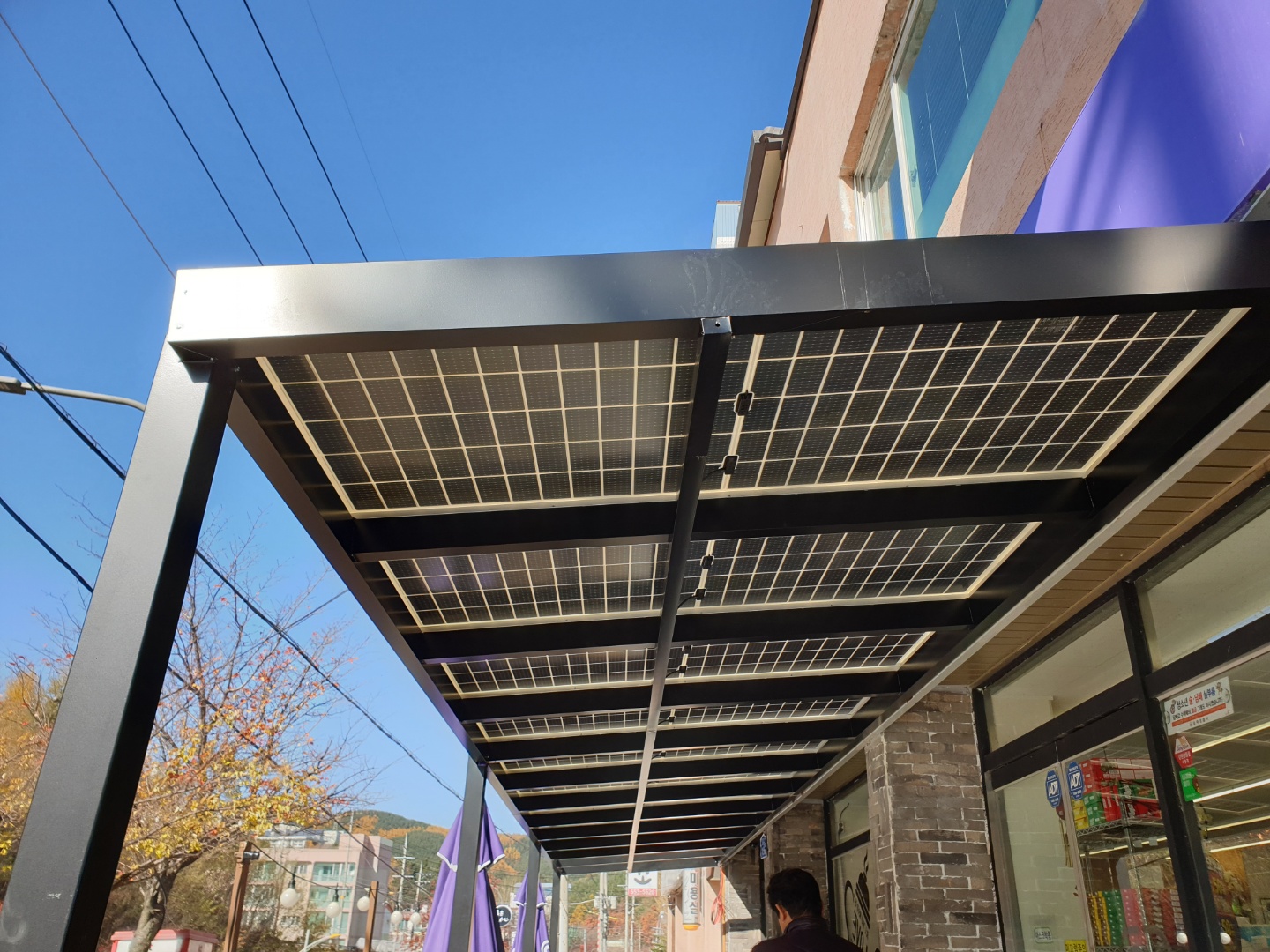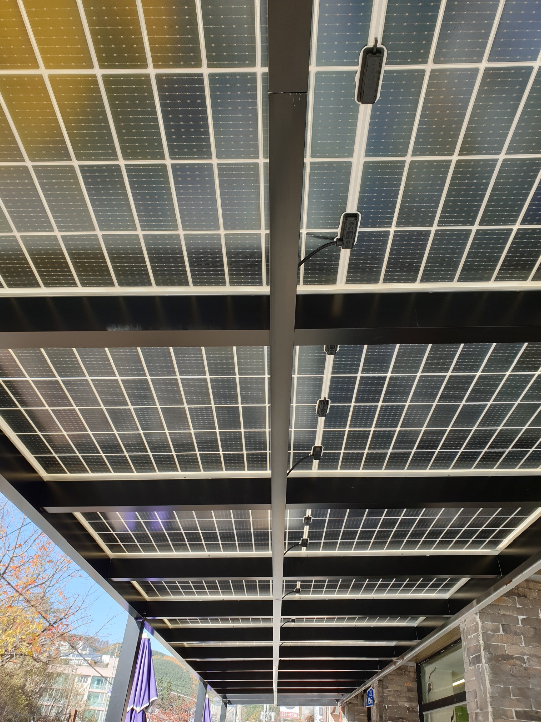 [태양광 시공사례] 양면모듈을 이용한 캐노피 불법 건축물을피한 태양광캐노피