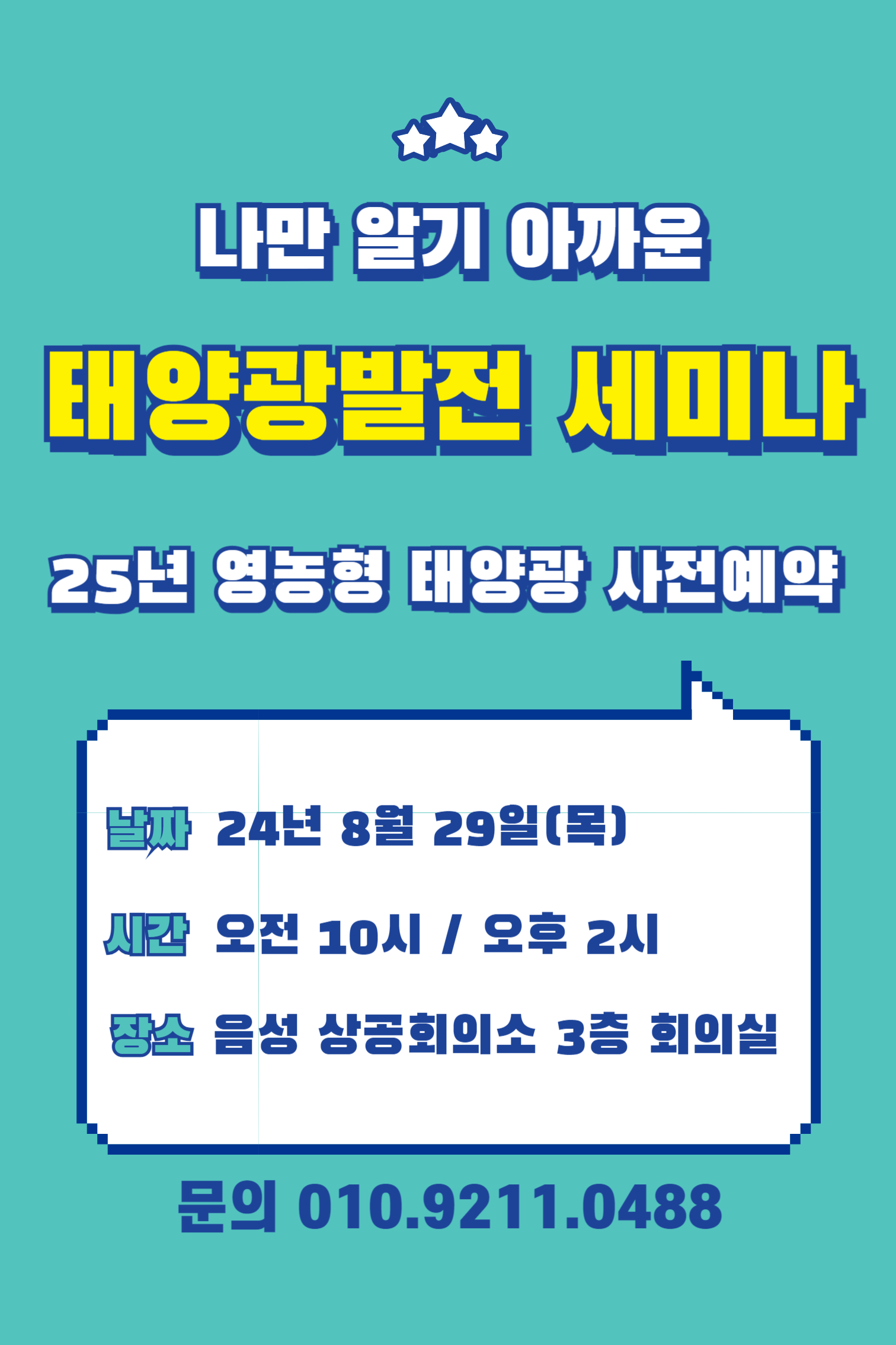 안녕하세요. 태양광발전전문기업 (주)태웅솔라에서 "태양광발전 사업성"을 주제로 음성군 시민을 대상으로 찾아가는 태양광세미나를 개최합니다. *일시 : 2024년 8월 29일(목) 오전10시 / 오후2시 *장소 : 음성군 상공회의소 3층 세미나실 *주제 : 태양광발전 사업의 수익성 및 향후 시장분석 *상담내용 : 태양광발전사업 수익성, 진행절차 무자본 태양광발전사업 임대형 태양광발전사업 업체 최저가 시공가능 *예약필수 : 010-9211-0488 *참가자전원 사은품 증정 |