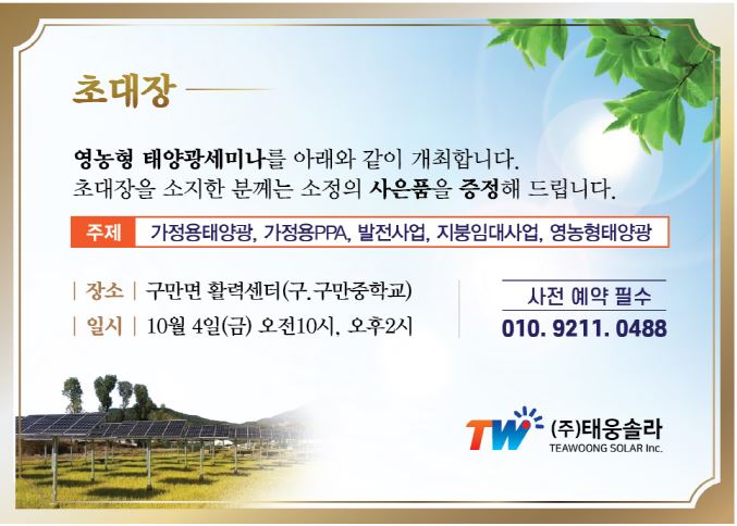 문의가 많은 관계로 꼭 사전예약을 권합니다. 사전예약 : 1855-4688 #태양광발전 #영농형태양광 #영농형발전 #25년영농형발전 #태양광발전세미나 #가정용태양광 #태양광캐노피 #태양광파고라 #태양광주차장 #태웅솔라 #구만면활력센터 #경남고성군구만면 #구만활력센터 #구만중학교 |