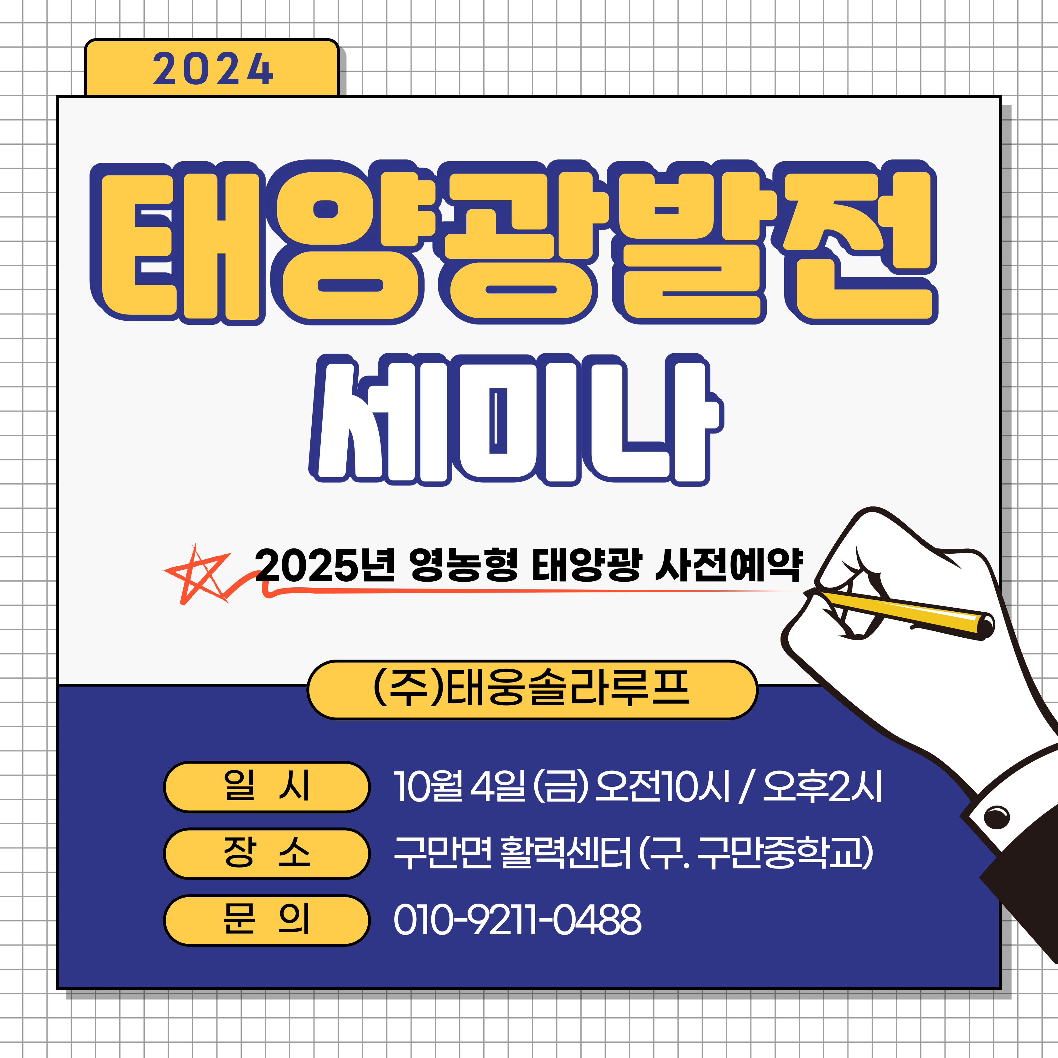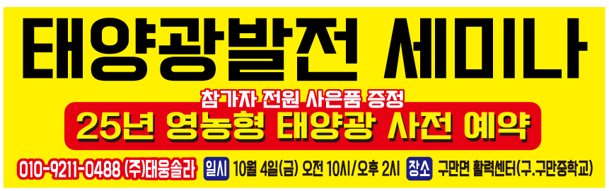 ※ 일 시 : 2024년 10월 4일(금) 오전10시 / 오후2시 ※ 장 소 : 경남 고성군 구만면 "구만면 활력센터" (구. 구만중학교) ※ 주 제 - 가정용 태양광 ※ 예약필수 : 010-9211-0488