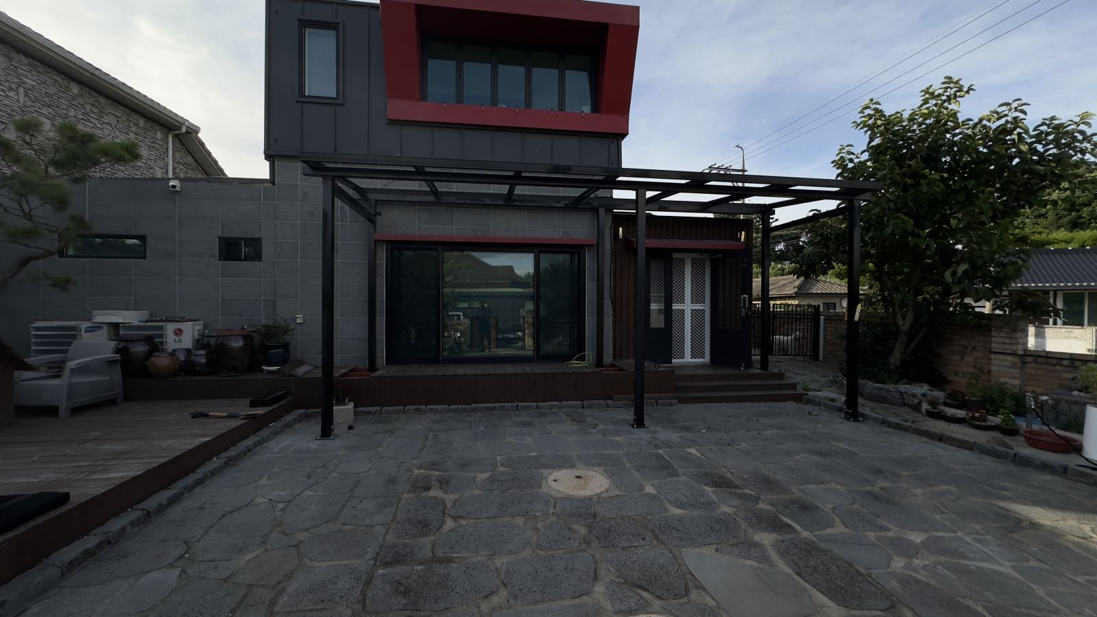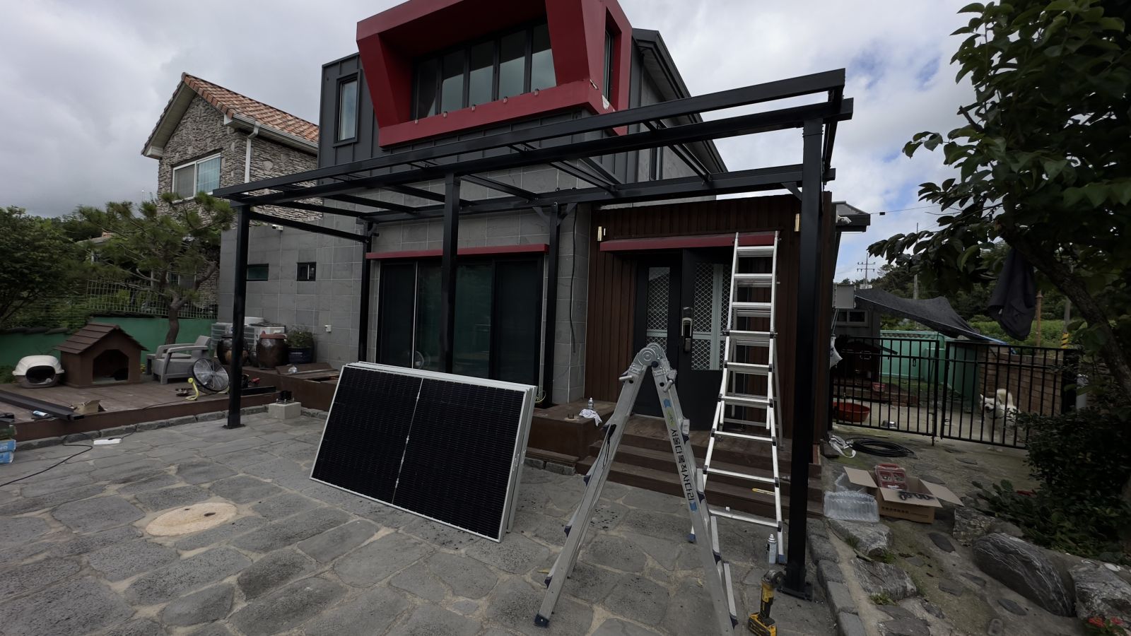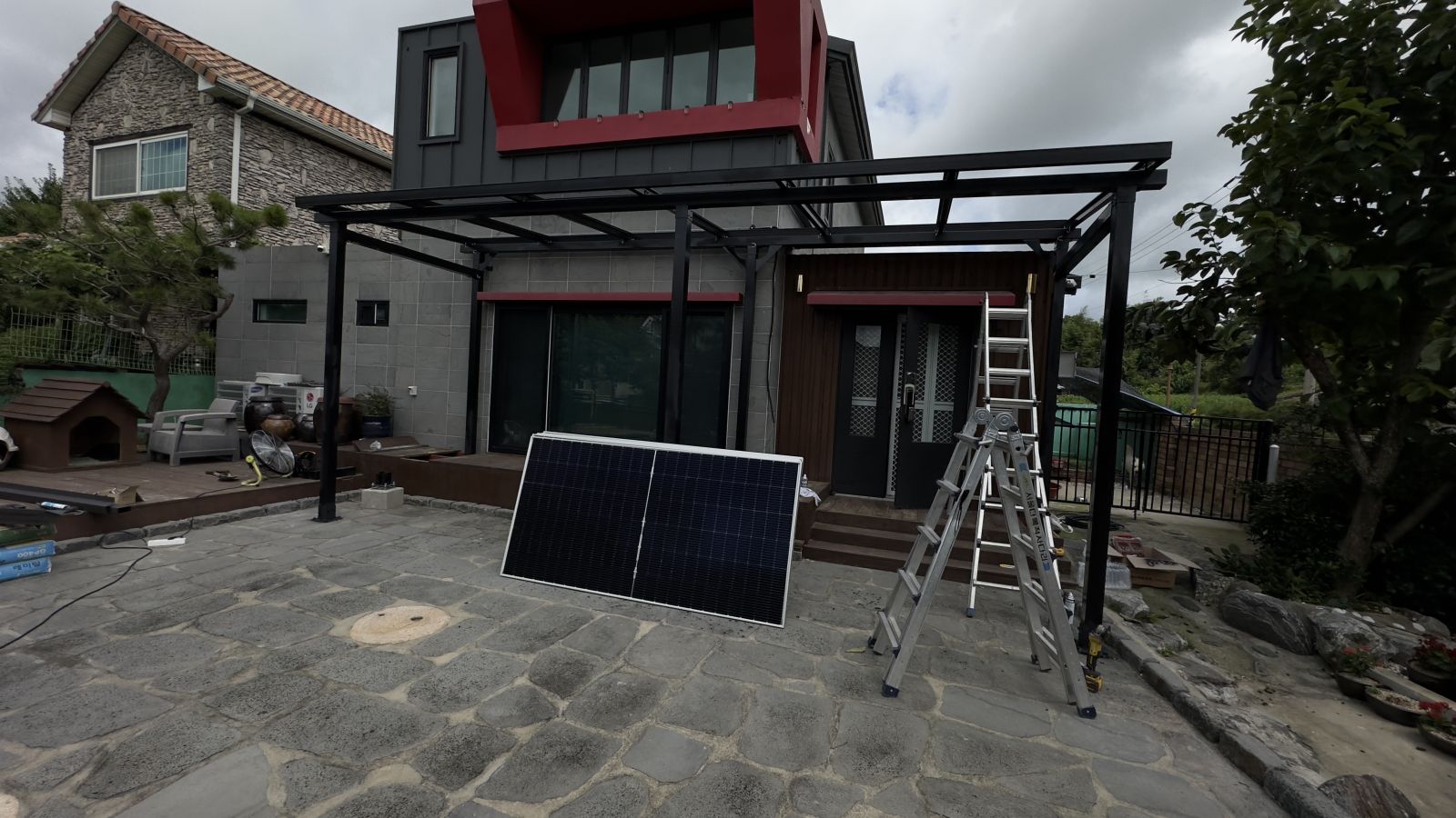 멋진 디자인의 전원주택입니다. 전면이 확 트임은 너무나 좋지만, 그늘막이 없어서 태양광캐노피 설치를 의뢰하셨습니다. 돌마당이며 그네, 나무들, 장독대 등 건축주님의 부지런함이 엿보이는 나무데크로 올려져 있는 전원주택입니다. *태양광 캐노피 3D동영상 무료견적