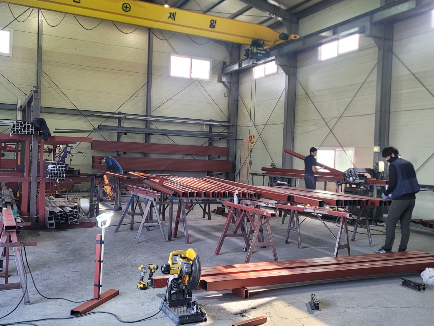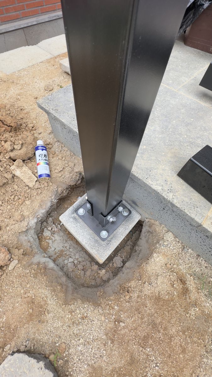 태웅솔라는 직접 설계한 도면으로 자체공장에서 전문적으로 구조물을 세심하게 제작합니다. 태양광 구조물을 신속하게 제작하고 혹시나 변경이 있을 때는 바로바로 반영될 수 있는 장점이 있습니다. 먼저 태양광 방수캐노피의 가장 베이스가 되는 바닥 구조물을 콘크리트와 단단히 고정을 시킵니다. 태웅솔라의 전문시공팀의 손길을 받은 기둥들을 하나하나 세우고 있습니다. ![]()