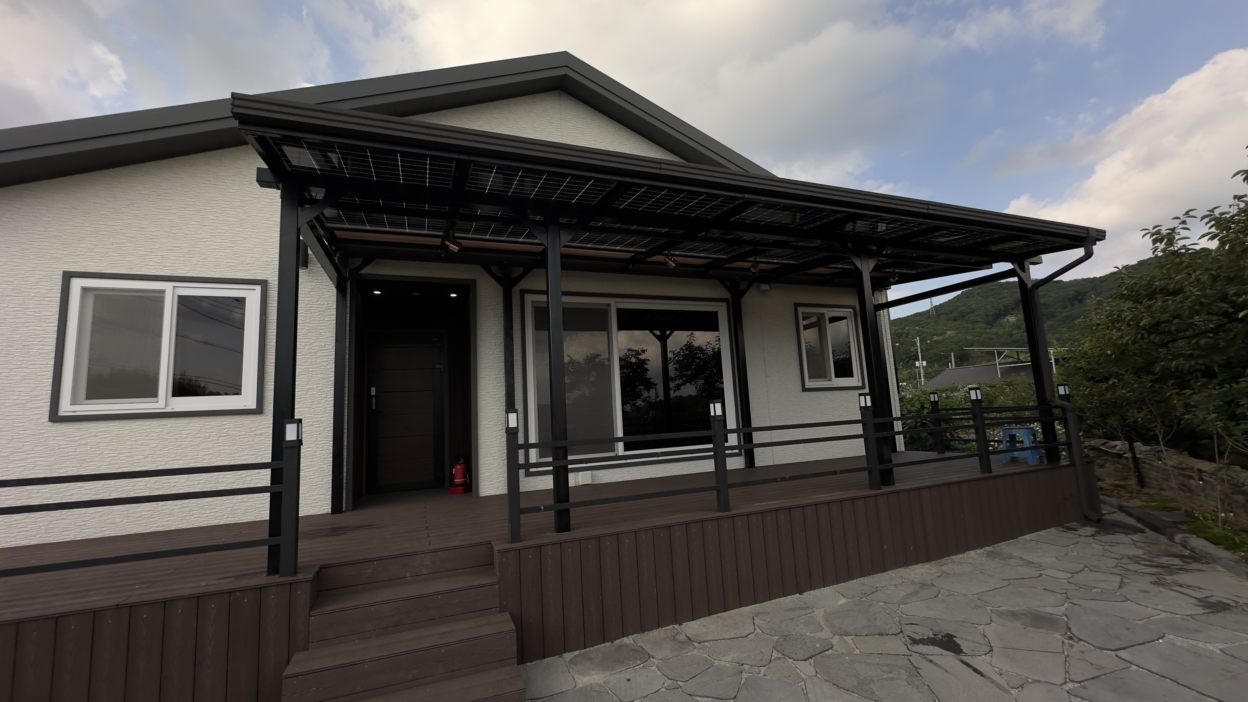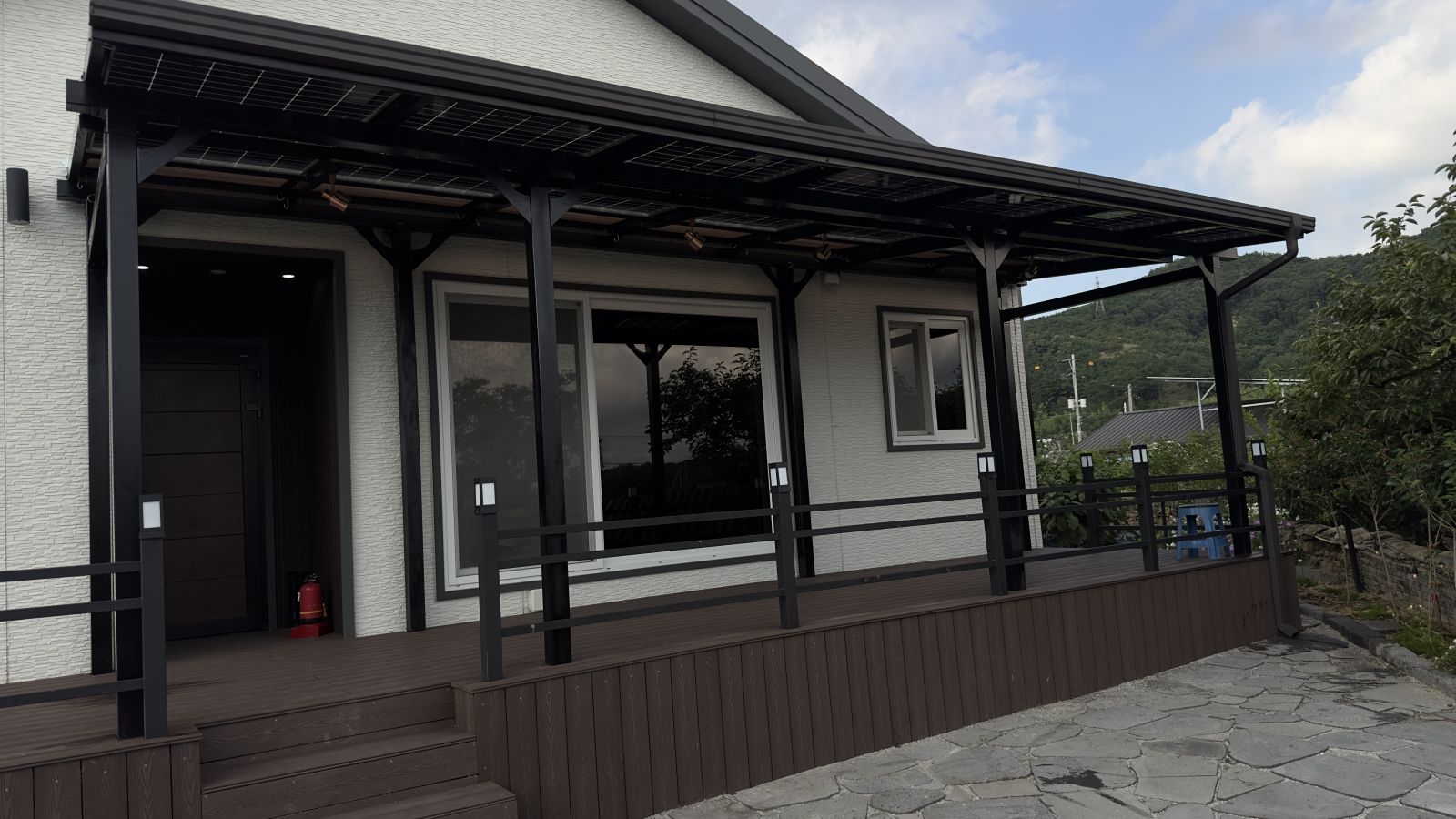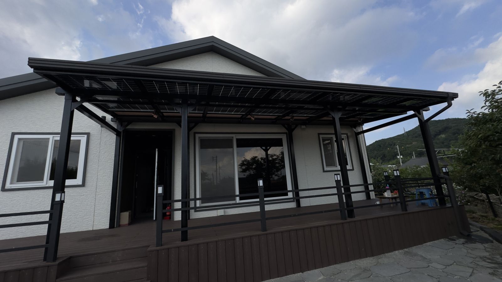 태양광캐노피 구조물 색상이 블랙으로 전원주택과 잘 어울리고 세련된 이미지로 업그레이드 되어 외관적으로나 기능적으로 주택의 가치가 확 올라가게 됩니다.