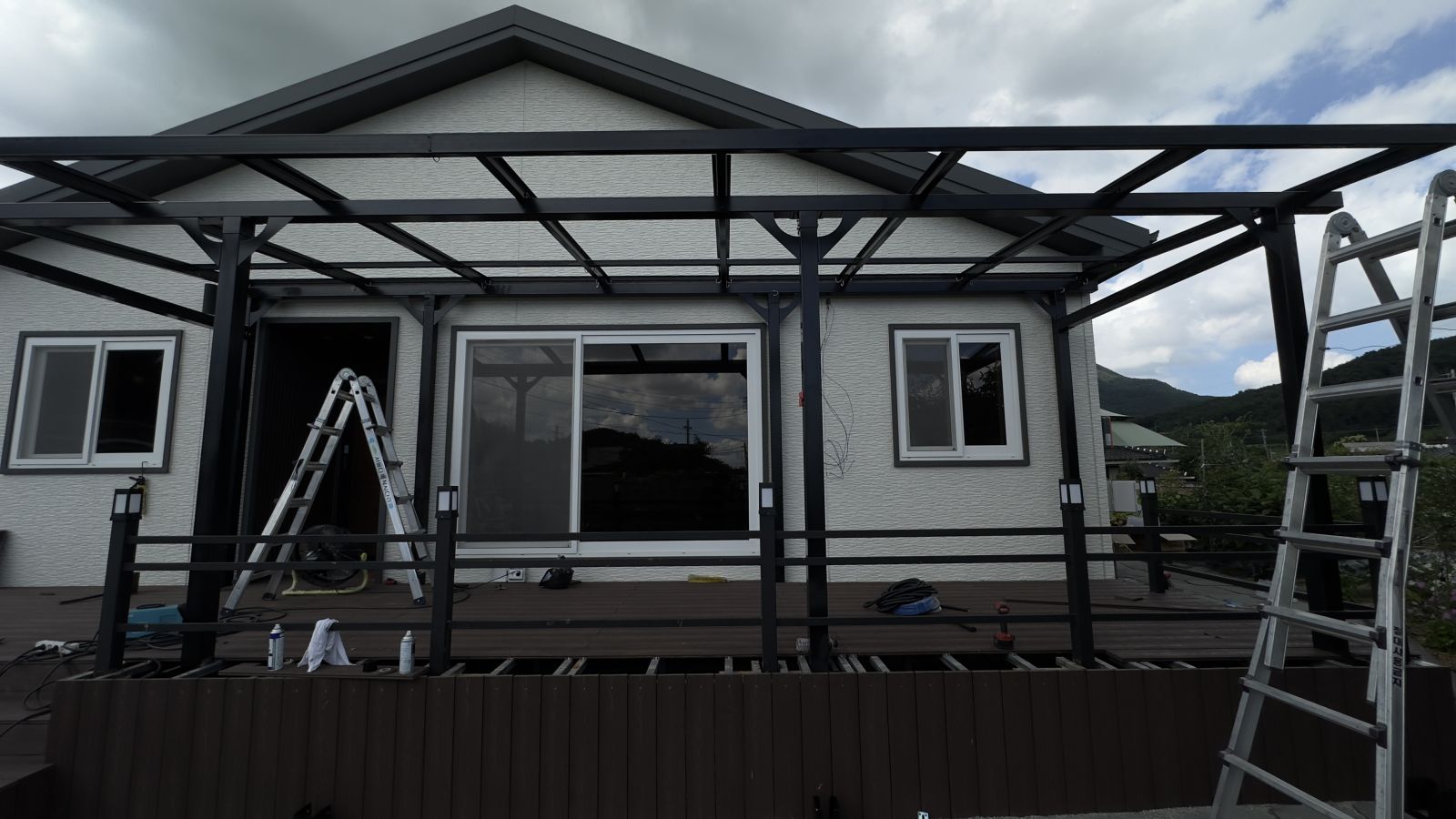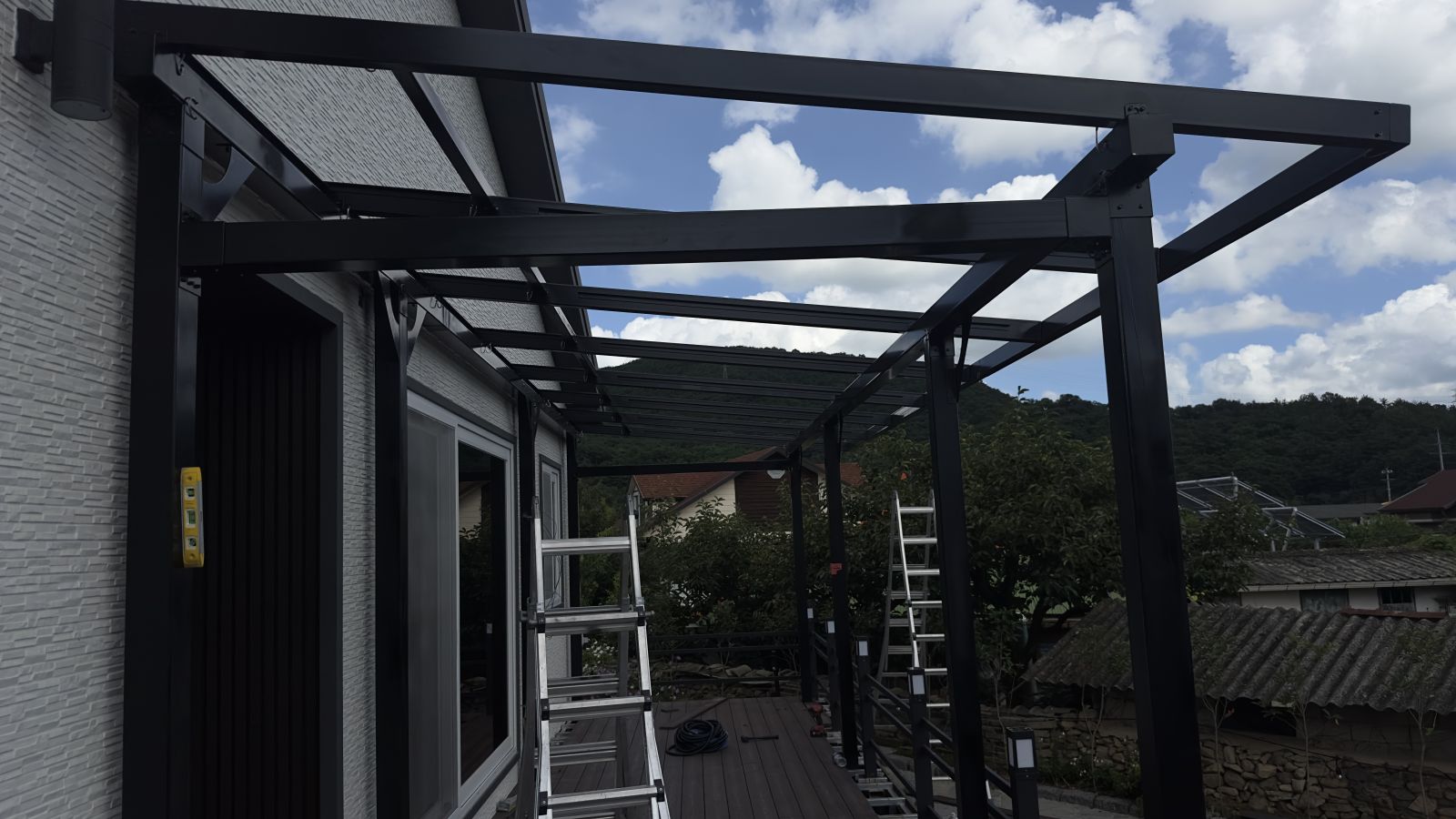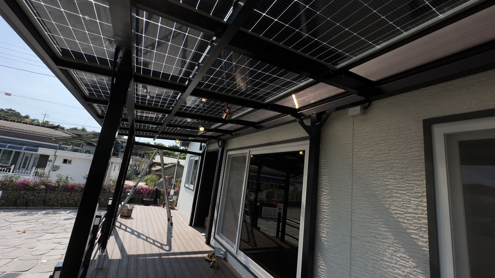 주택 출입구가 나무 데크로 되어있어서 데크 외곽쪽 부분을 분리해서 태양광 캐노피 기둥을 튼튼하게 세우고 각각의 구조물을 조립합니다. ![]()