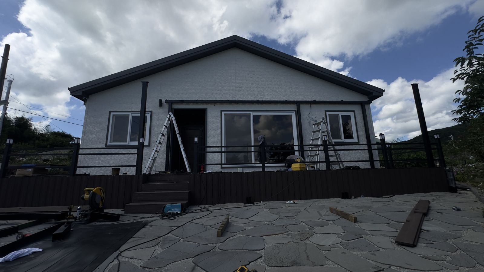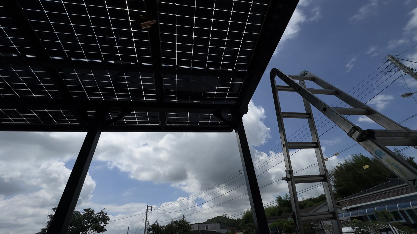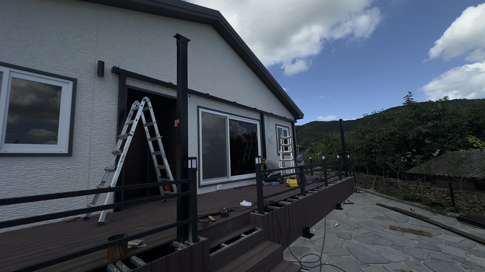 주택 출입구가 나무 데크로 되어있어서 데크 외곽쪽 부분을 분리해서 태양광 캐노피 기둥을 튼튼하게 세우고 각각의 구조물을 조립합니다. ![]()