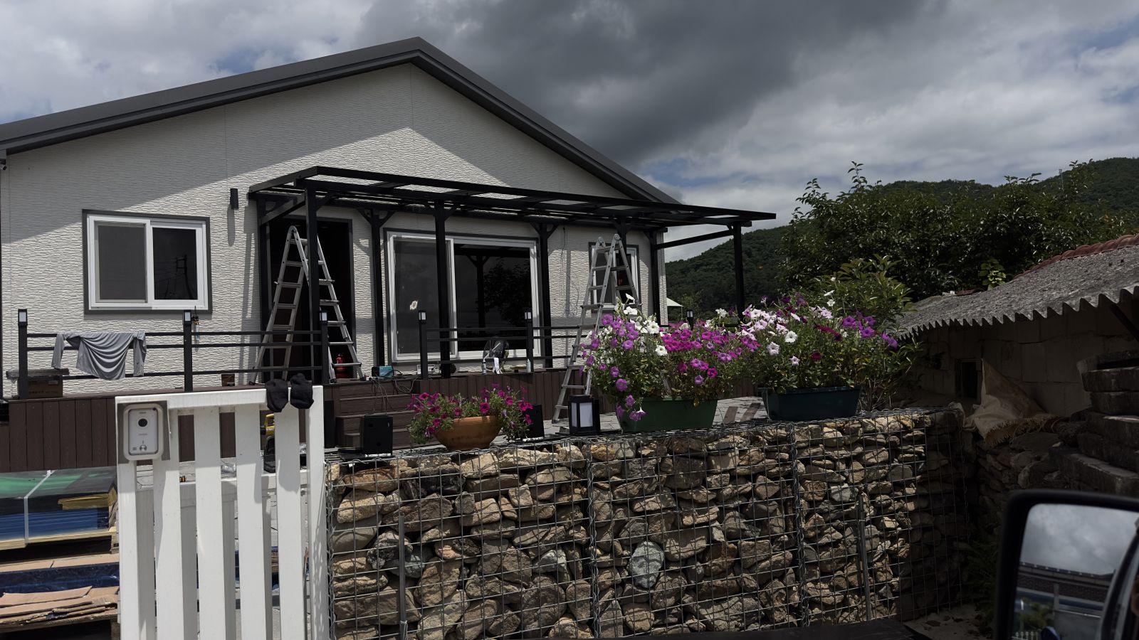 장성에 예쁜 꽃이 활짝 핀 화분이 돌담위에 가지런히 놓여져있는 흰색 대문 안으로 멋진 전원주택이 있습니다. 처마가 없으니 햇빛과 눈, 비에 그대로 노출되어 있으시죠. 그늘막이나 캐노피를 검색하다가 저희 태웅솔라의 '태양광 캐노피'를 보시고 바로 연락을 주셨습니다. 태양광캐노피 3D동영상 무료견적