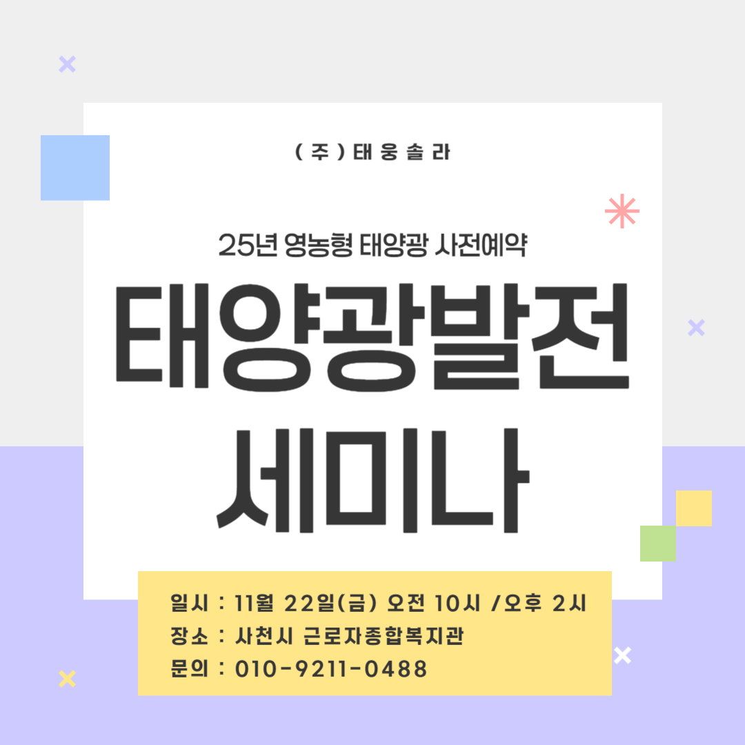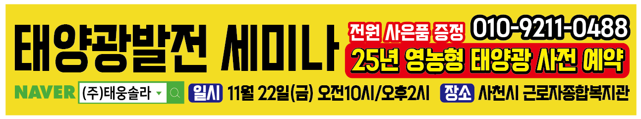 안녕하세요~ 태양광발전전문기업 (주)태웅솔라에서 "태양광발전 사업성"을 주제로 찾아가는 태양광세미나 다섯번째 시간을 개최합니다. 농민과 귀농, 귀촌을 꿈꾸는 이들의 안정적인 소득증가를 위한 영농형, 태양광발전사업 세미나에 여러분을 초대합니다. ◐ 일시 : 2024년 11월 22일(금) 오전10시 / 오후2시 ◐ 장소 : 사천시 근로자종합복지관 ◐ 예약필수 : ☎ 010-9211-0488 (전화연결) 태양광발전 세미나 ■ 가정용 태양광 ■ 가정용 PPA ■ 태양광 발전사업 ■ 지붕임대사업 ■ 영농형 태양광 *사전예약 : 010-9211-0488* 태양광 발전사업의 수익성 및 향후 시장분석과 영농형 태양광에 관한 모든 것을 주제로 (주)태웅솔라의 찾아가는 태양광발전 세미나에서 태양광에 관한 궁금증을 해결해보시기 바랍니다. 참가하신 모든분들께는 소정의 사은품을 증정합니다. 문의가 많은 관계로 꼭 사전예약을 권합니다. #태양광발전 #영농형태양광전 #25년영농형발전 #태양광발전세미나 |