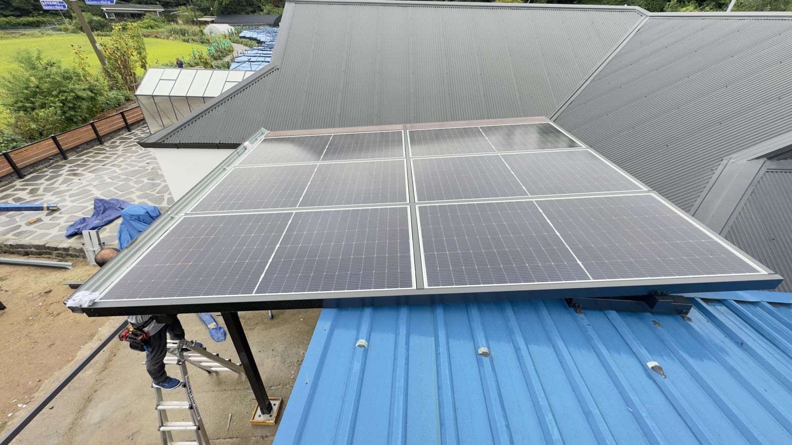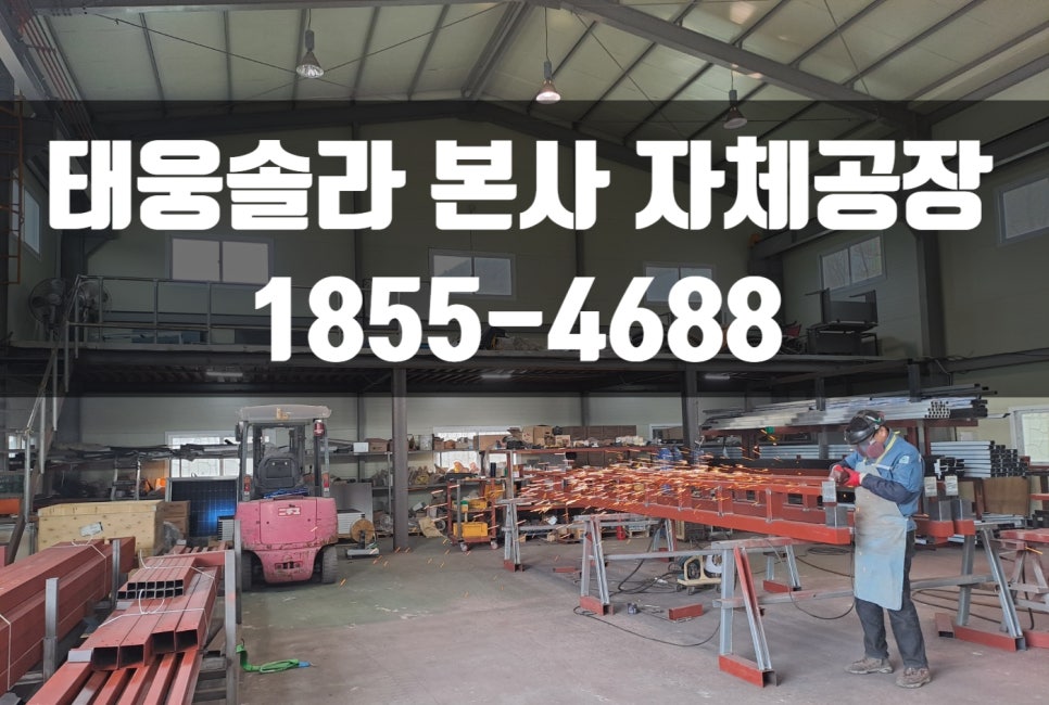 저희 태웅솔라는 직접 설계한 도면으로 본사 자체공장에서 전문적으로 구조물을 세심하게 제작합니다. 태양광 구조물을 정확하게 제작하고 중간에 변경사항이 생기면 바로바로 수정이 가능한 이유도 자체 공장을 운영하는 최고 장점이라 할 수 있습니다. ![]() ![]() ![]() ![]() ![]() ![]() 태양광 구조물들은 모두 고온분체도장으로 특수 제작해서 30년 이상을 사용해도 녹이 발생한다거나 변색의 걱정없이 사용하실 수 있습니다. 제작된 구조물은 현장으로 배송하여 전문 시공팀이 책임 시공을 하는 시스템으로 운용되고 있습니다. ![]() ![]() 태양광캐노피 구조물 색상은 블랙으로 선택하셨네요. 많은 고객님들께서는 블랙을 많이 선택하시는데 색상은 선택가능하십니다. 모든 구조물 작업은 수직과 수평을 측정하여 본사 전문 시공팀이 튼튼하게 시공합니다. ![]() ![]() 양면 그라스 모듈 시공