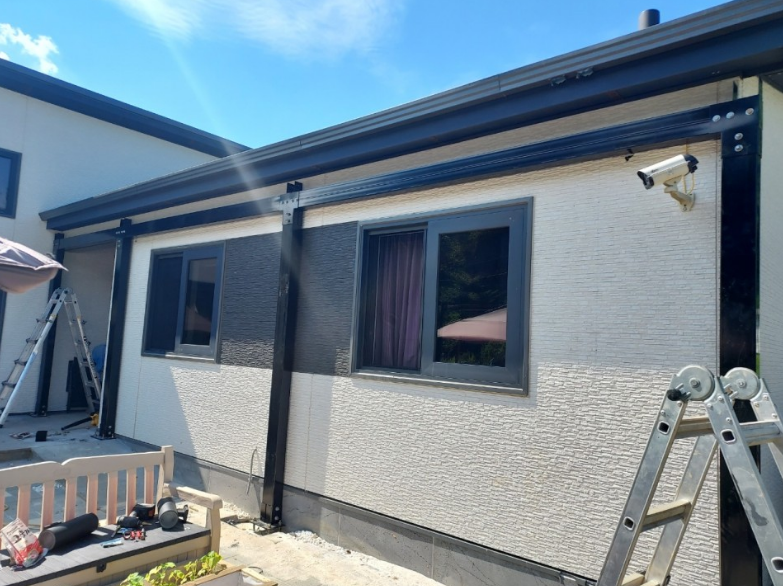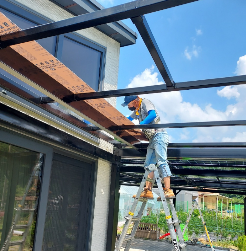 경기도 파주시에 있는 전원주택에 설치해드렸던 현장입니다. ![]() 고객분이 처음에는 렉산으로 캐노피를 설치하려다가 불법건축물임을 아시고 급하게 저희 태웅솔라에 연락을 주셨답니다. ![]() 태웅솔라에서 사용하는 양면그라스모듈은 유리이기때문에 태양광캐노피를 지지하는 기둥들이 견고하게 고정이 되어야만 모든 구조물이 안정감있게 세워진답니다. ![]() 그렇기에 맨땅에 베이스작업을 하는데 무척 시간을 들이고 공을 들여서 작업을 하고요. ![]() 이렇게 기둥을 세우고 난 다음에는 수평방향의 거더들을 얹고 빗물받이를 설치하게 됩니다. ![]() 저희가 사용하는 구조물들은 모두 저희 공장에서 직접 분체도장한 구조물들로 견고함과 세련됨을 동시에 잡았답니다. ![]() 이렇게 구조물들이 완성되면 화룡점정으로 양면그라스모듈을 하나씩 하나씩 채워가야하는데요. ![]() 정부지원을 받는 모듈은 단면이라 이렇게 햇빛이 투과가 안되고 방수도 안되는 단점이 있는데 비해 저희가 사용하는 양면그라스모듈은 방수와 셀투과를 완벽하게 구현합니다! ![]() 게다가 아래쪽에는 레일등까지 달아 야간시간대에도 무리없이 활용을 할 수 있도록 해드렸답니다. ![]() 그렇기에 단순한 햇빛차단이나 비가림막이 아니라 실내에서 바깥뷰을 볼때도 미관을 헤치지않고 낮과 밤 모두 사용이 가능한 전천후 플레이스를 만들어 줍니다. ![]() 또한 태양광발전도 단면모듈보다 훨씬 많아 전기요금에도 상당한 도움이 됩니다. ![]() 태웅솔라는 오랜기간 태양광발전시설물에 대해 연구개발을 통해 현장에 꼭맞는 세련된 구조물을 설계하여 직접 시공하고 있습니다. 전기요금이 가파르게 오르고 있어 가정용캐노피 문의가 많은 상황이며, 기업용 BIPV 시공도 가능하니 편하게 문의주세요~ 문의 1855-4688 / 010-9700-3445 |