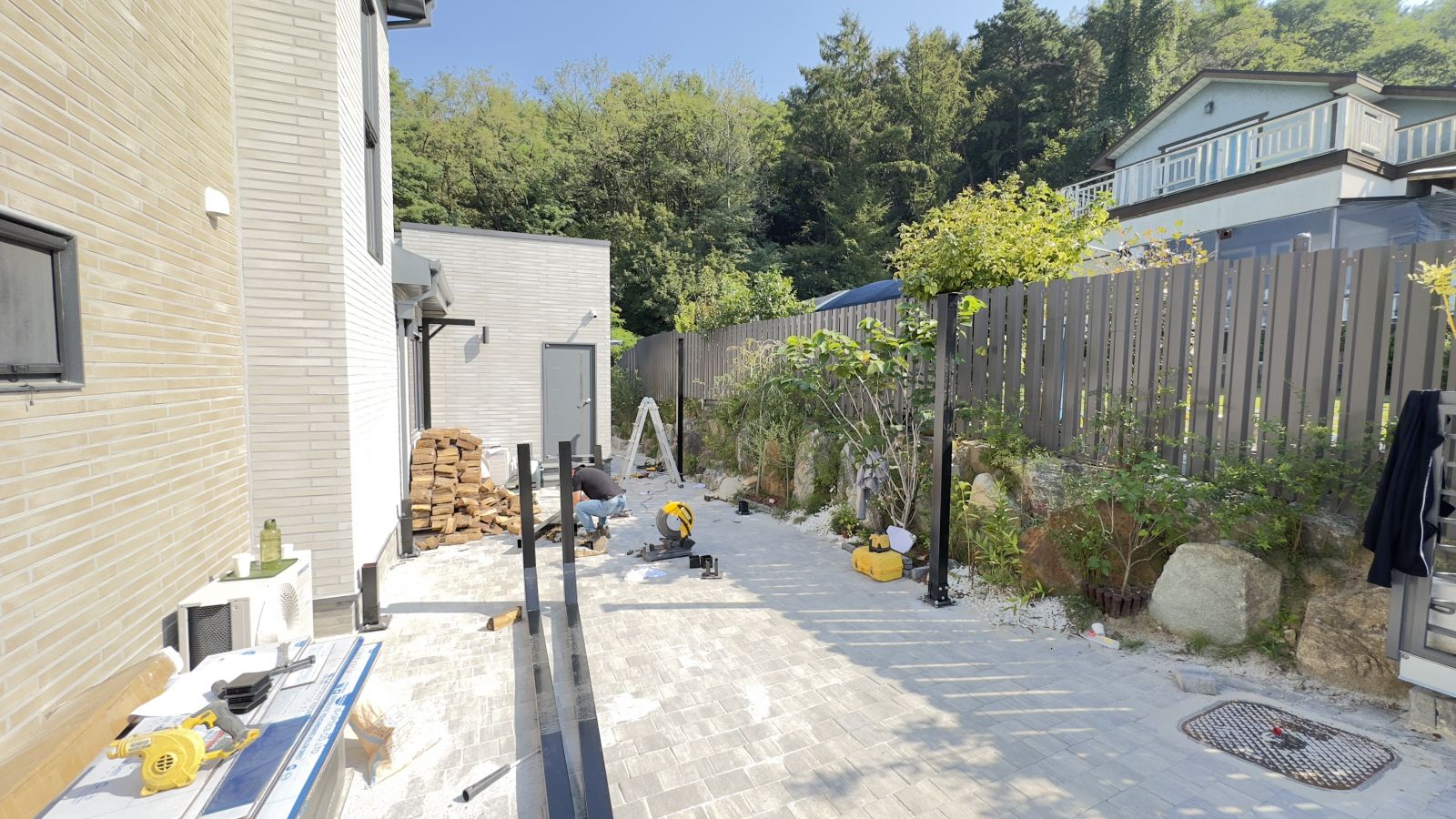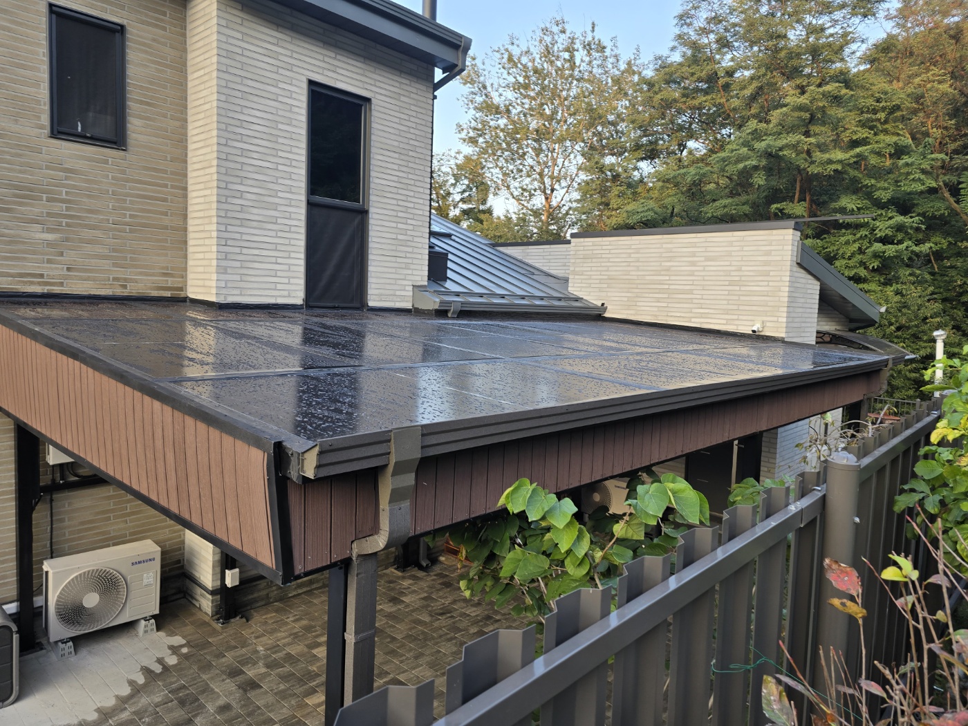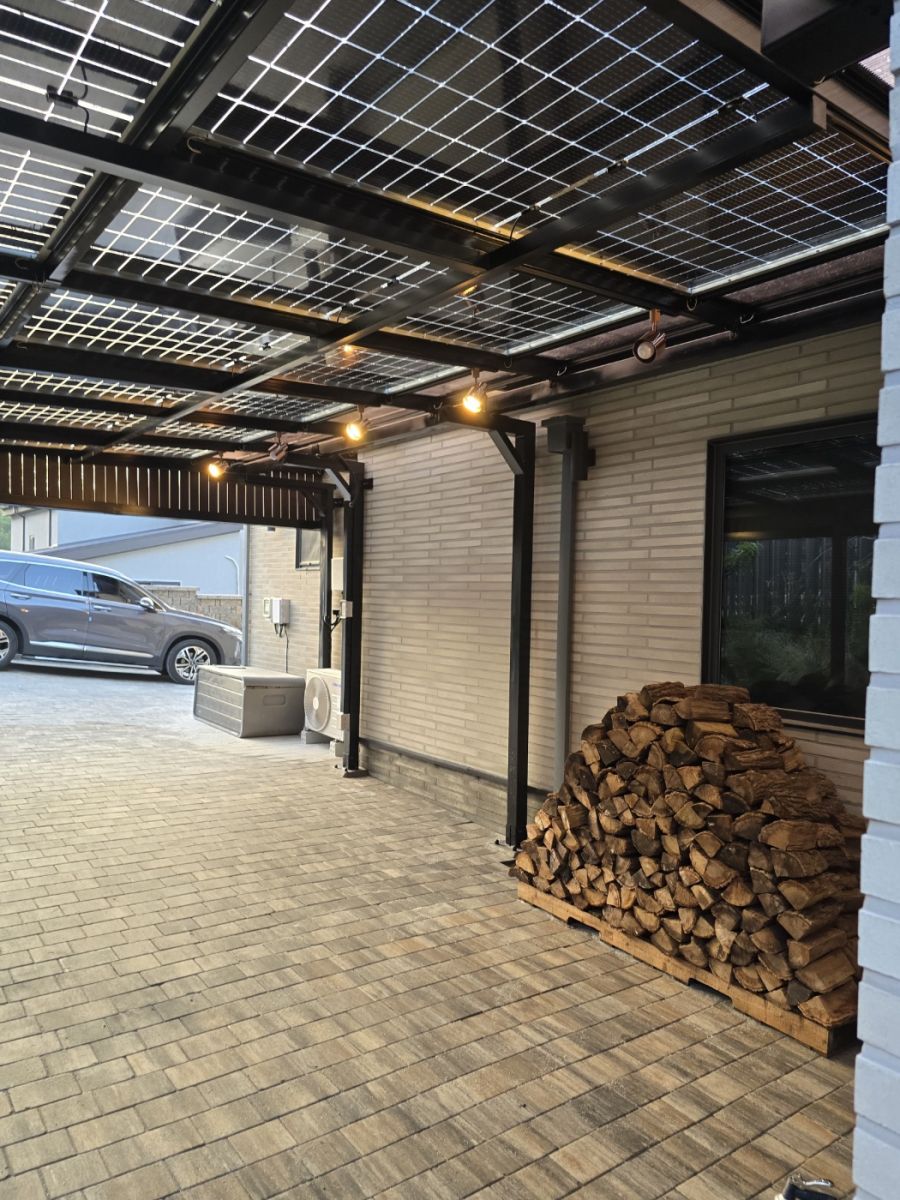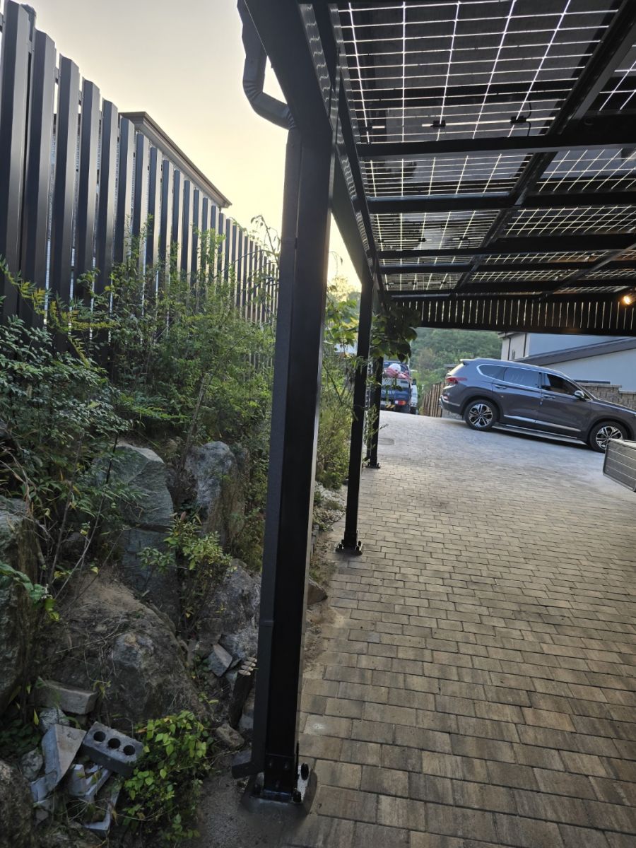 전원주택 본 건물과 울타리 사이를 주차공간으로 활용하고 계셨는데요~ 비바람에 그대로 차량을 노출되어 있었고 내 차를 뙤약빛과 폭우에서부터 벗어나는 방법으로 태양광주차장을 의뢰하셨습니다. 태양광 주차장 시공 전