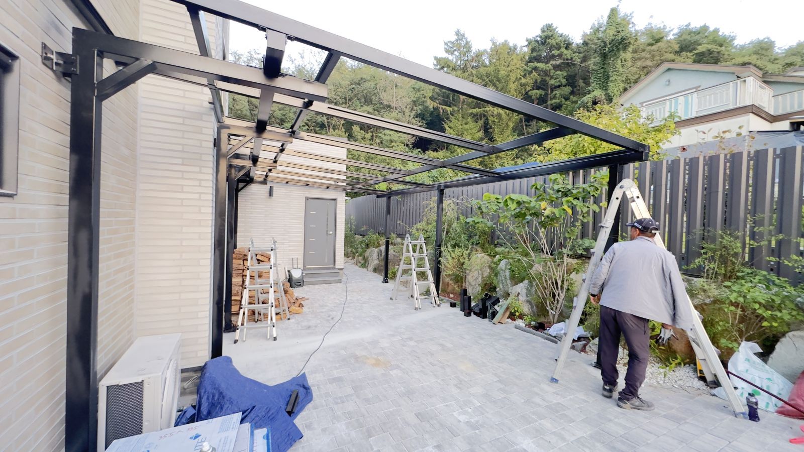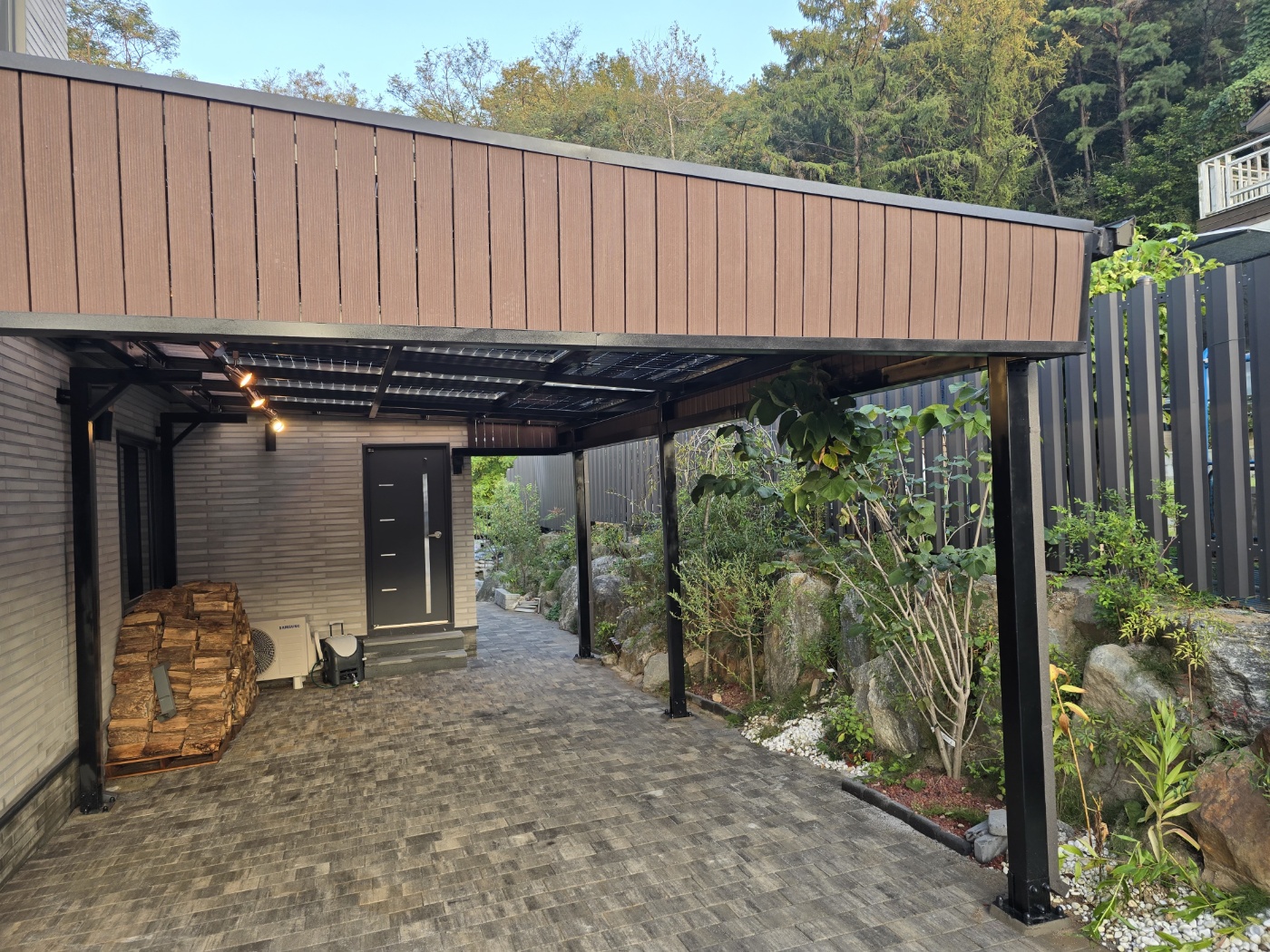 블랙의 구조물로 깔끔하고 웅장한 느낌마저 듭니다. 이번 현장에서는 썩지않는 방부목으로 인테리어 효과를 높였습니다.
