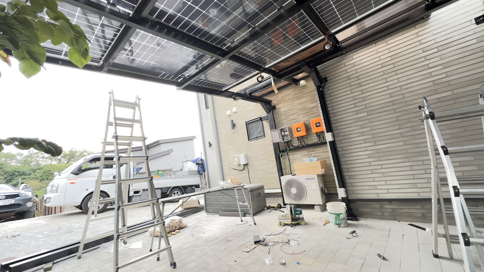 갑작스러운 폭우에도 빗물이 잘 내려갈 수 있도록 빗물받이도 당연히 시공해 드립니다. 태양광 주차장 인버터 설치 인버터는 벽면에 설치가 되었습니다. 경기도 안성시 현장에서는 4.95kW 요금상계거래 신청했습니다. 태양광 주차장 시공을 통해 에너지를 생산하고 전기요금 부담은 확실히 내려갑니다. 태양광 주차장 시공 후