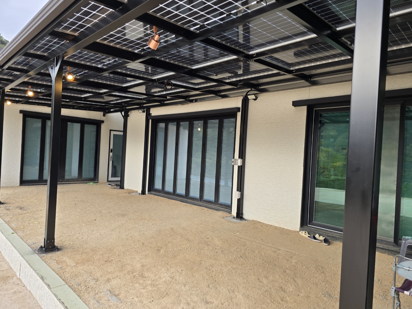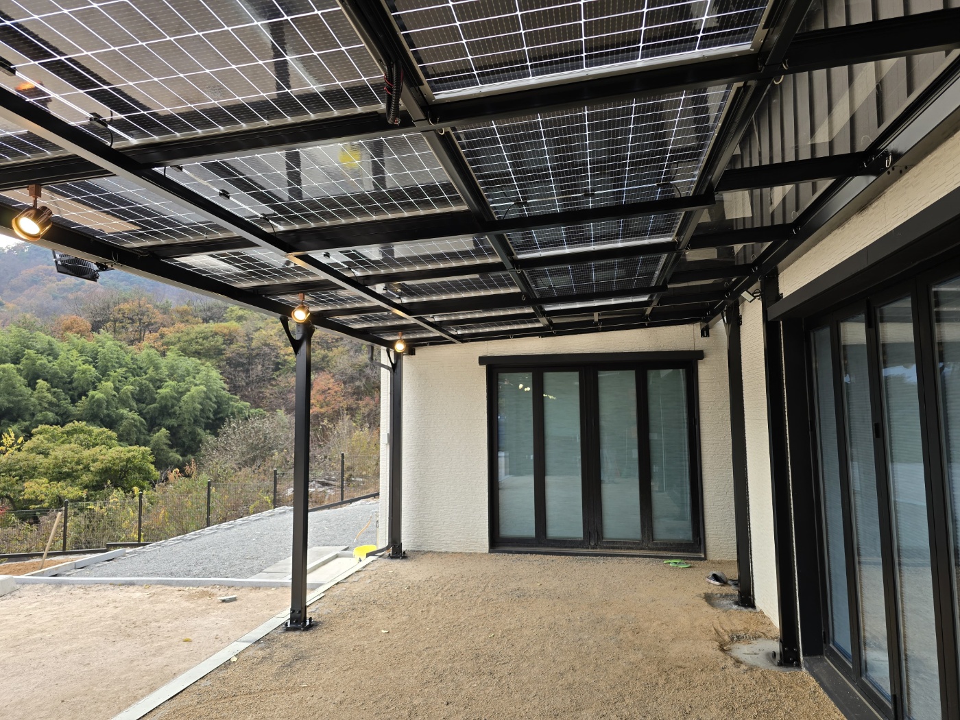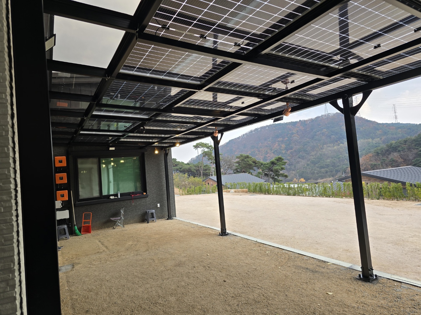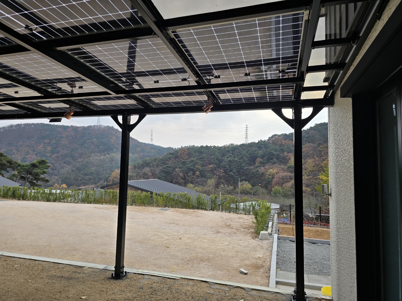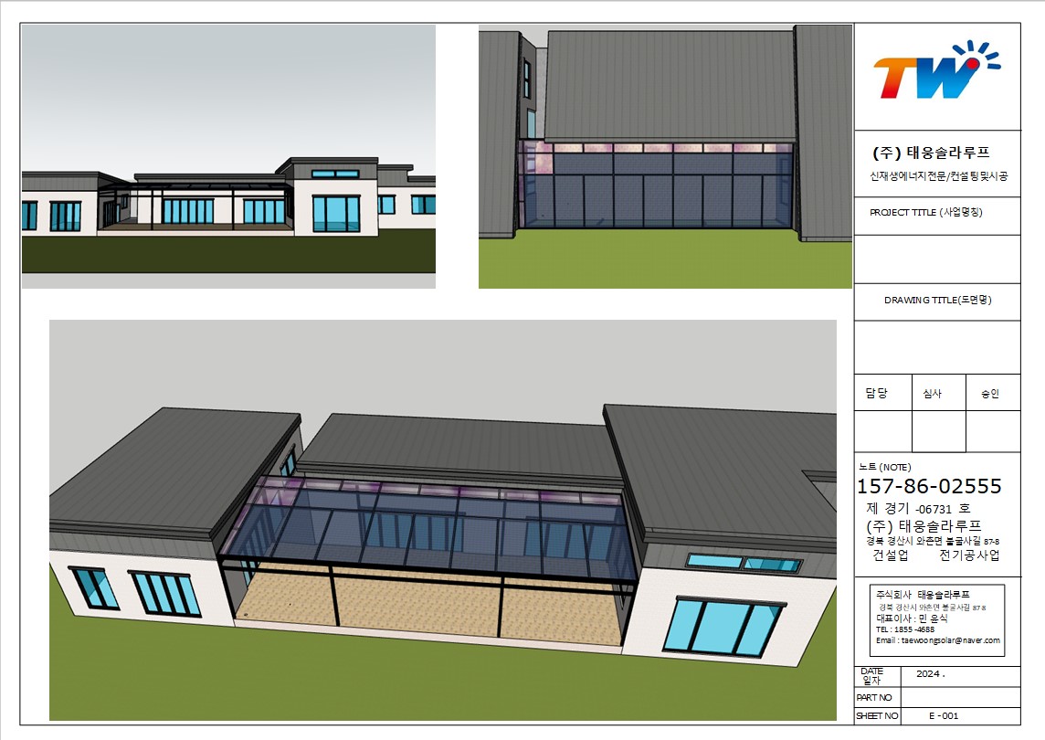 저희 태웅솔라로직접 찾아오셔서 상담을 하시고는 현장실측을 한 후에도 여러 번 의견을 조율했습니다. 옆으로 길쭉하게 규모가 있는 건물을 지으셨는데요. 산중턱으로 전원주택들이 모여있는 곳이라 햇빛이 참 잘 들었습니다. 그러나 너무 강한 햇빛은 실생활에 조금은 불편합니다. 그늘막이 필요하고 비가 오면 문밖에 나갈 수 없으니 입구를 넓게 사용하고 싶어서 태양광캐노피 설치를 의뢰하셨습니다. 전기요금 절약도 큰 이유였습니다. 3D 동영상 무료견적