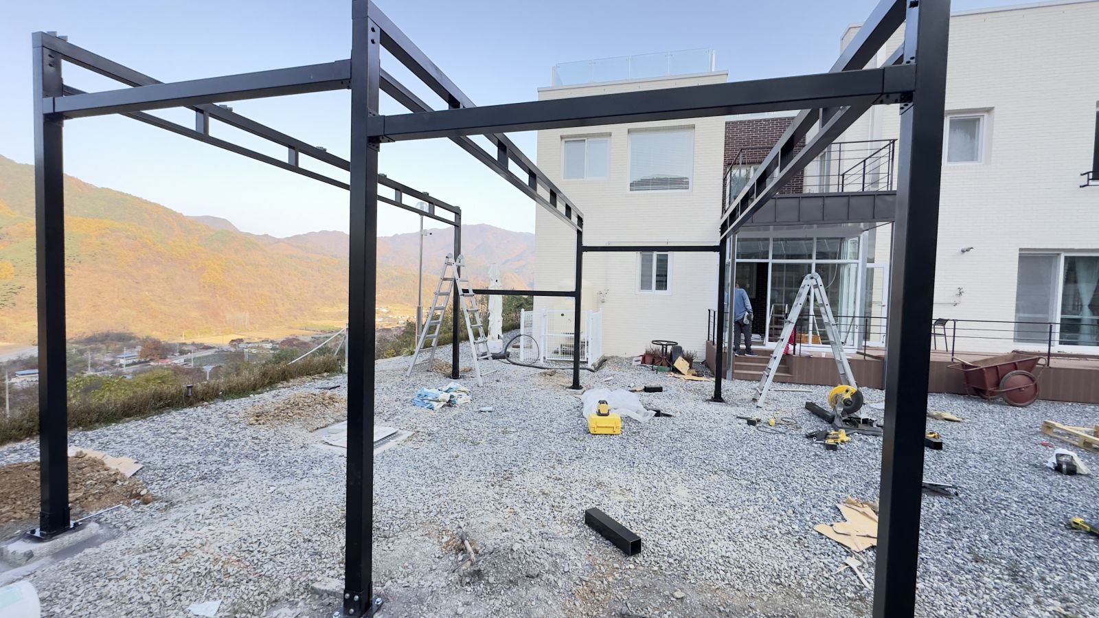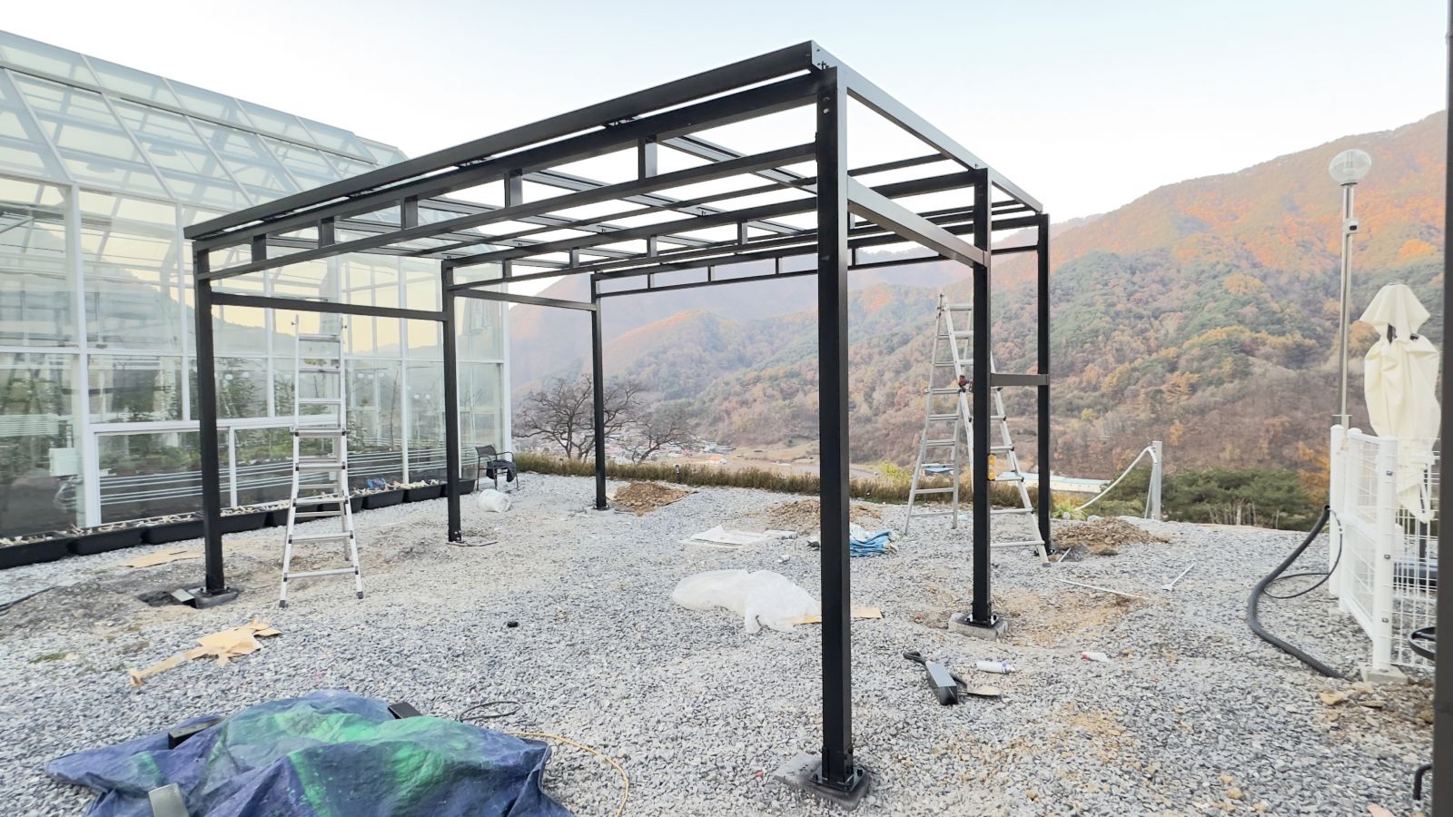 기둥 고정 작업을 완료하고 양면그라스모듈을 올릴 상층부 구조물을 설치하고 있는 모습입니다. ![]()
