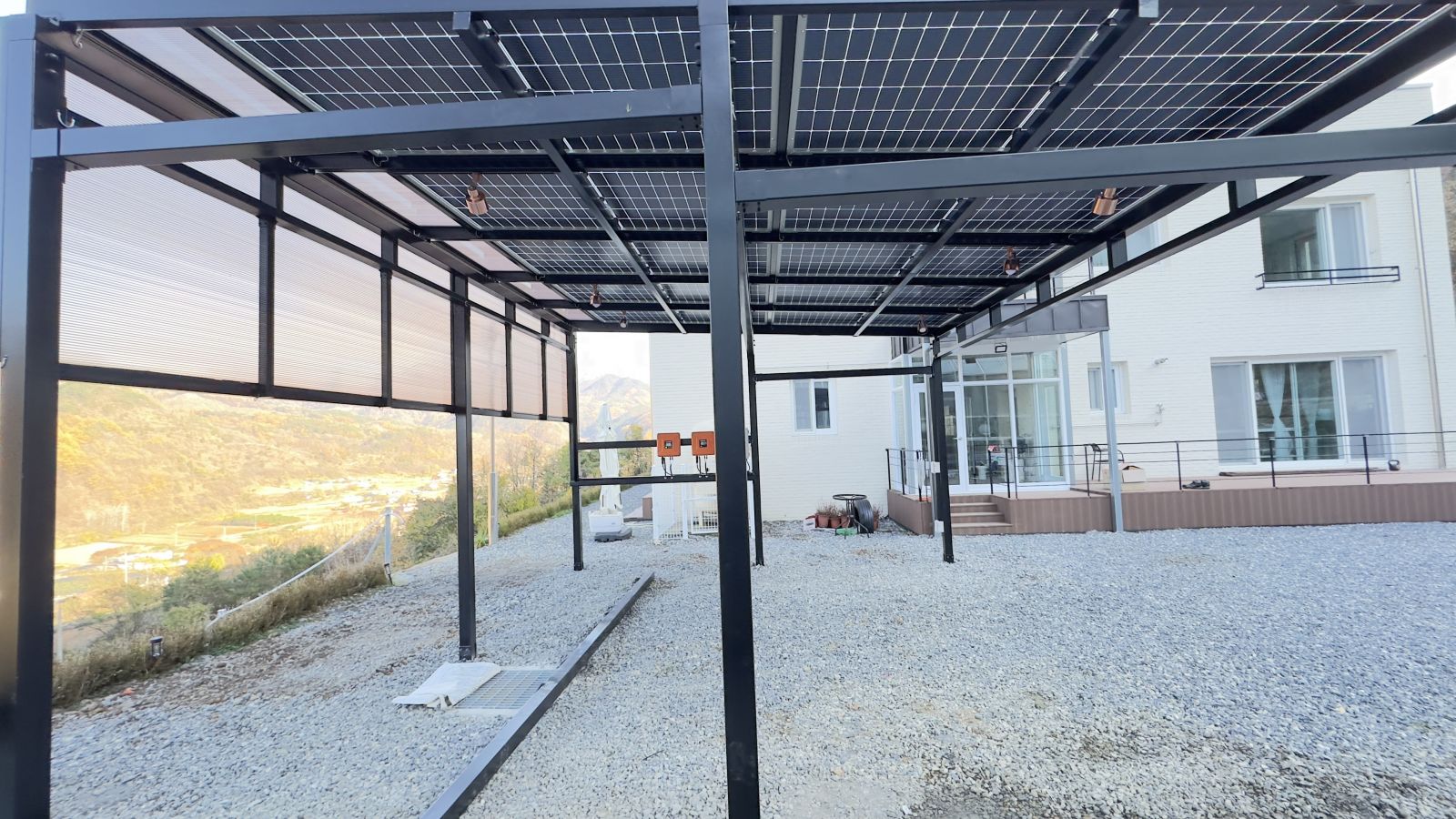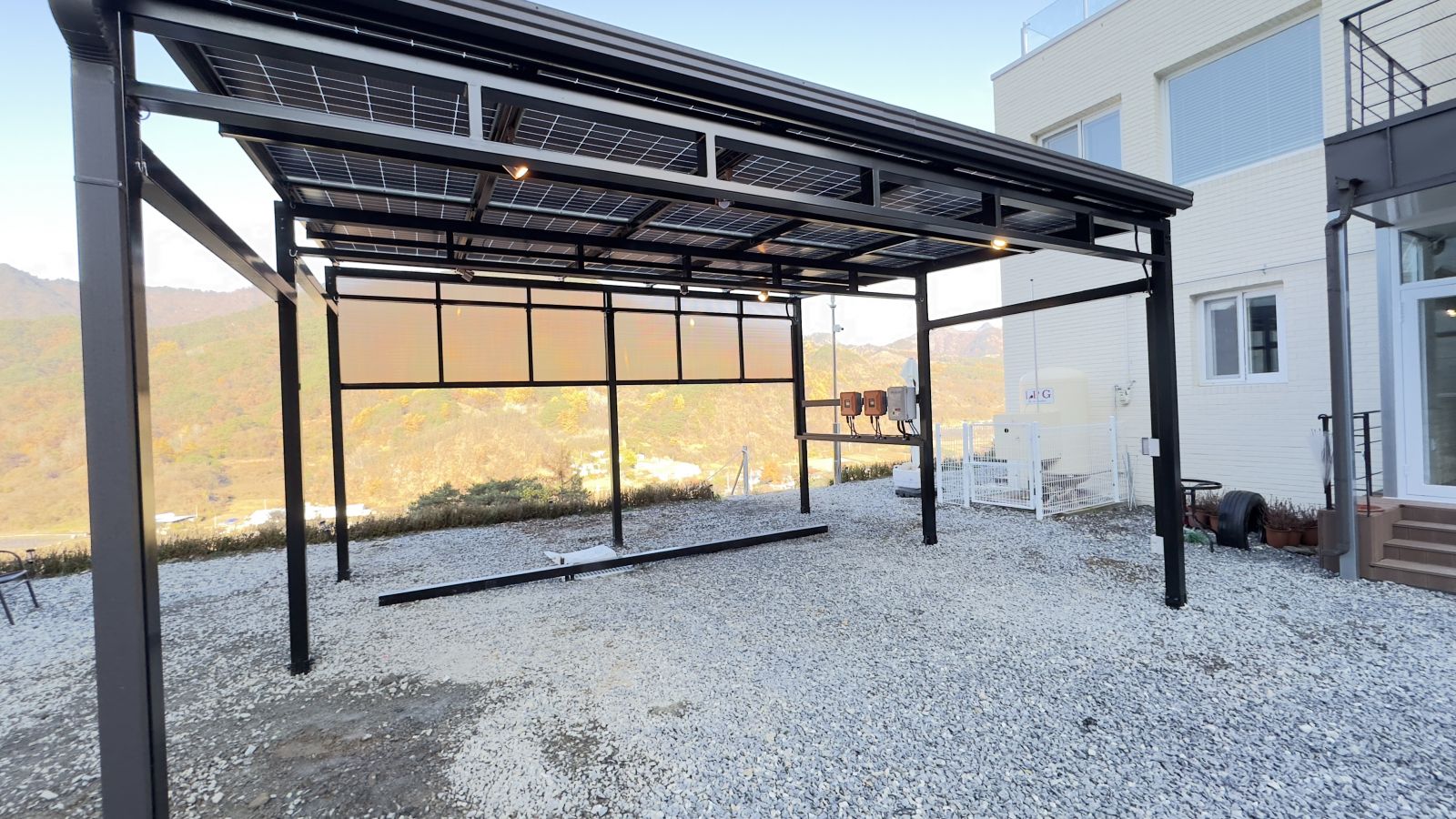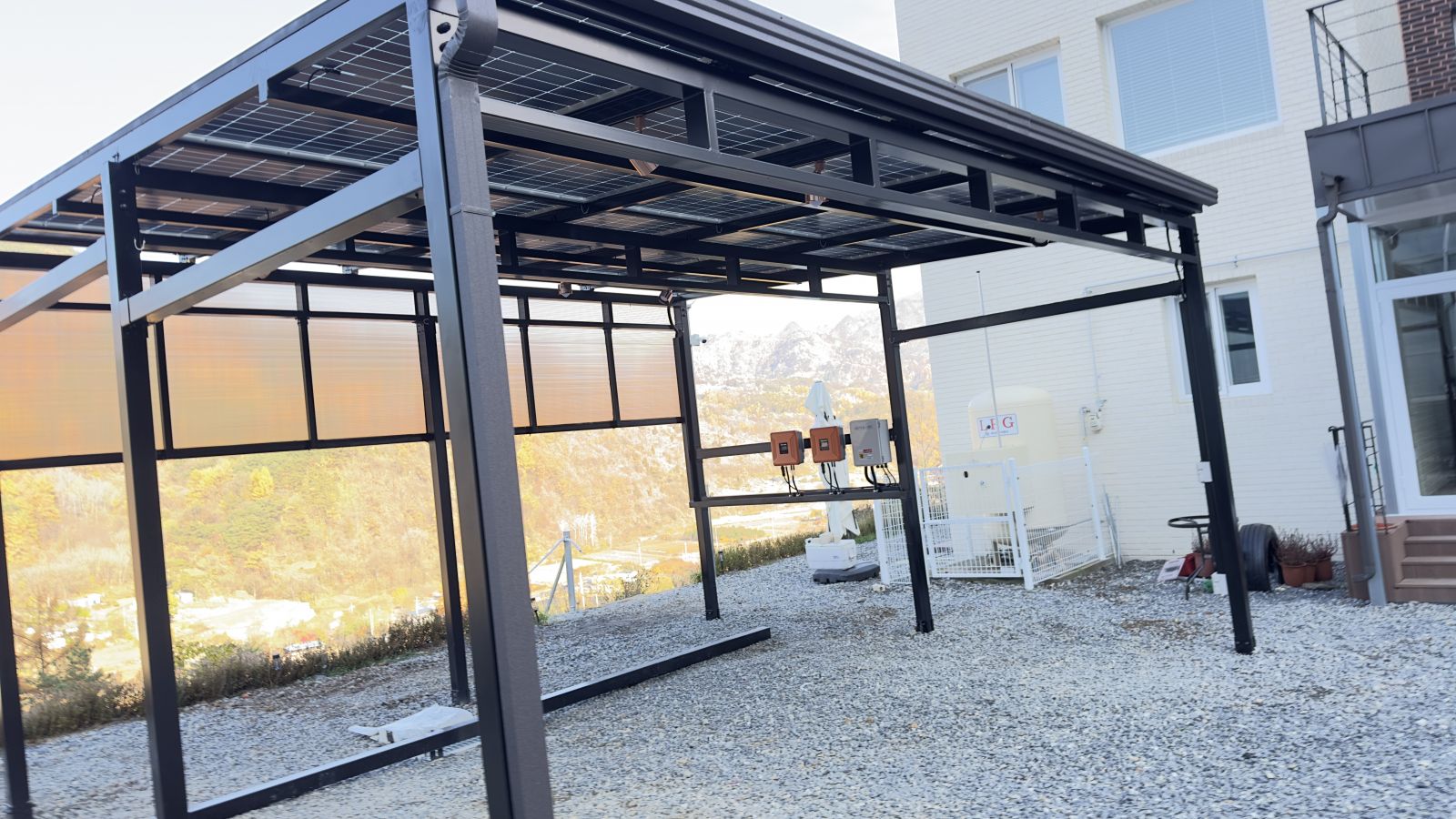 인버터는 태양광주차장 뒤쪽 벽에 설치가 되었습니다. 충북 단양군 현장에서는 5.5kW 요금상계거래 신청했습니다. 태양광 주차장 시공을 통해 에너지를 생산하고 전기요금 부담은 확실히 내려갑니다.