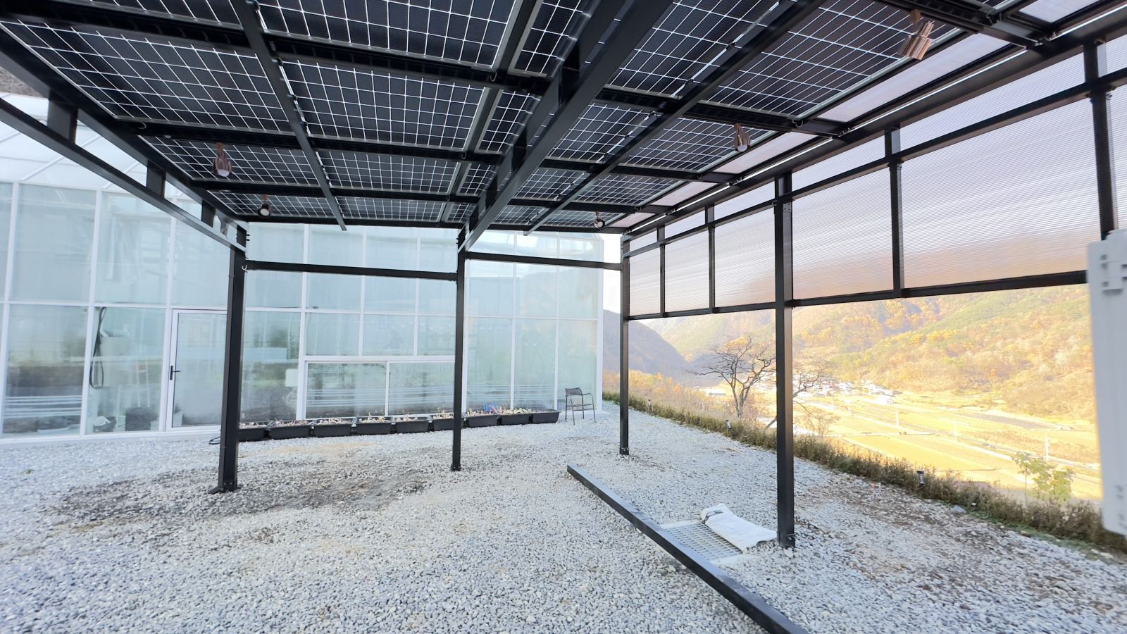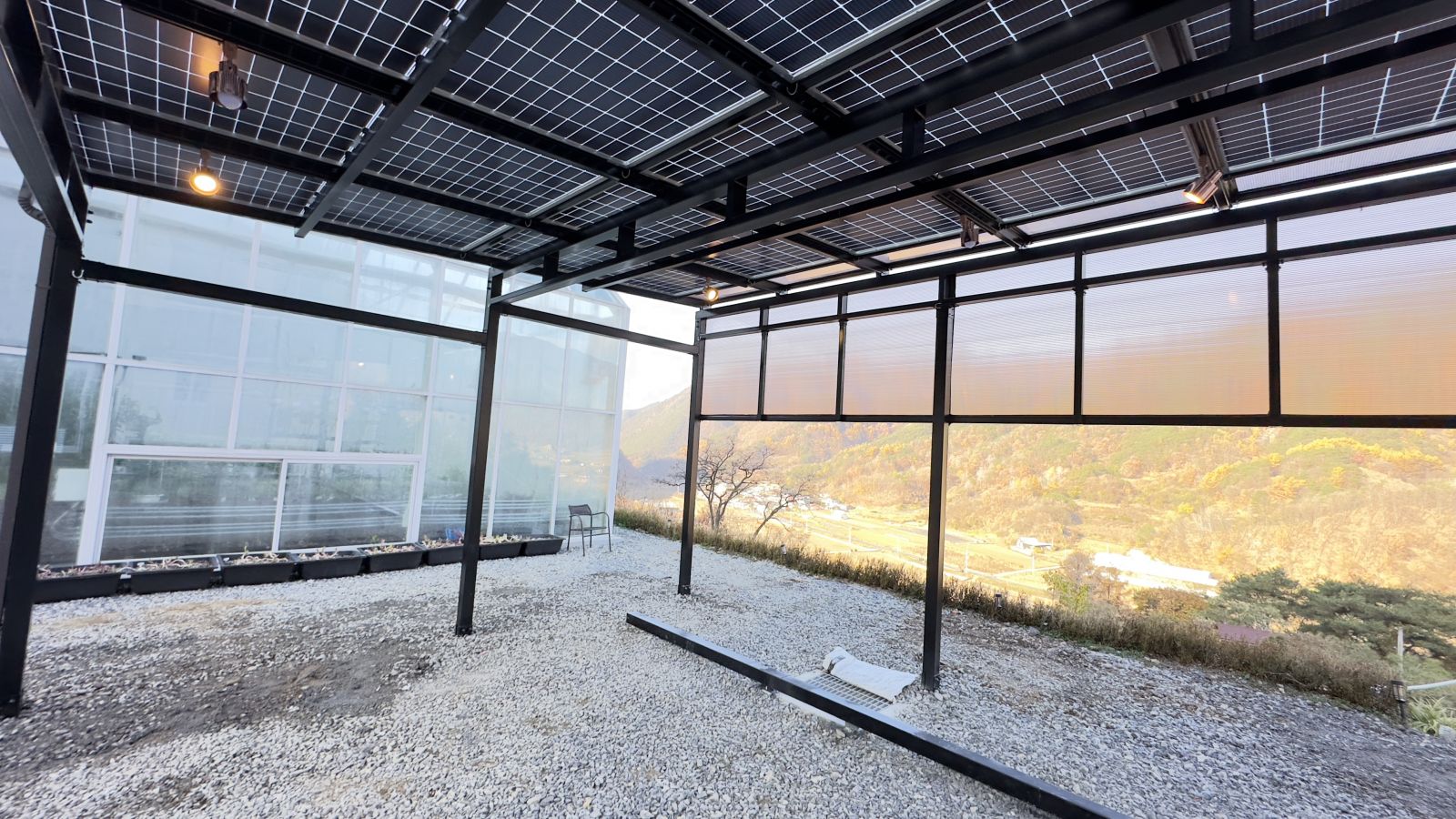 양면그라스모듈은 단면모듈에 비해 전기발전량이 높고 모듈 아래에서도 답답하지않게 햇빛이 환하게 비치도록 설치됩니다. ![]()