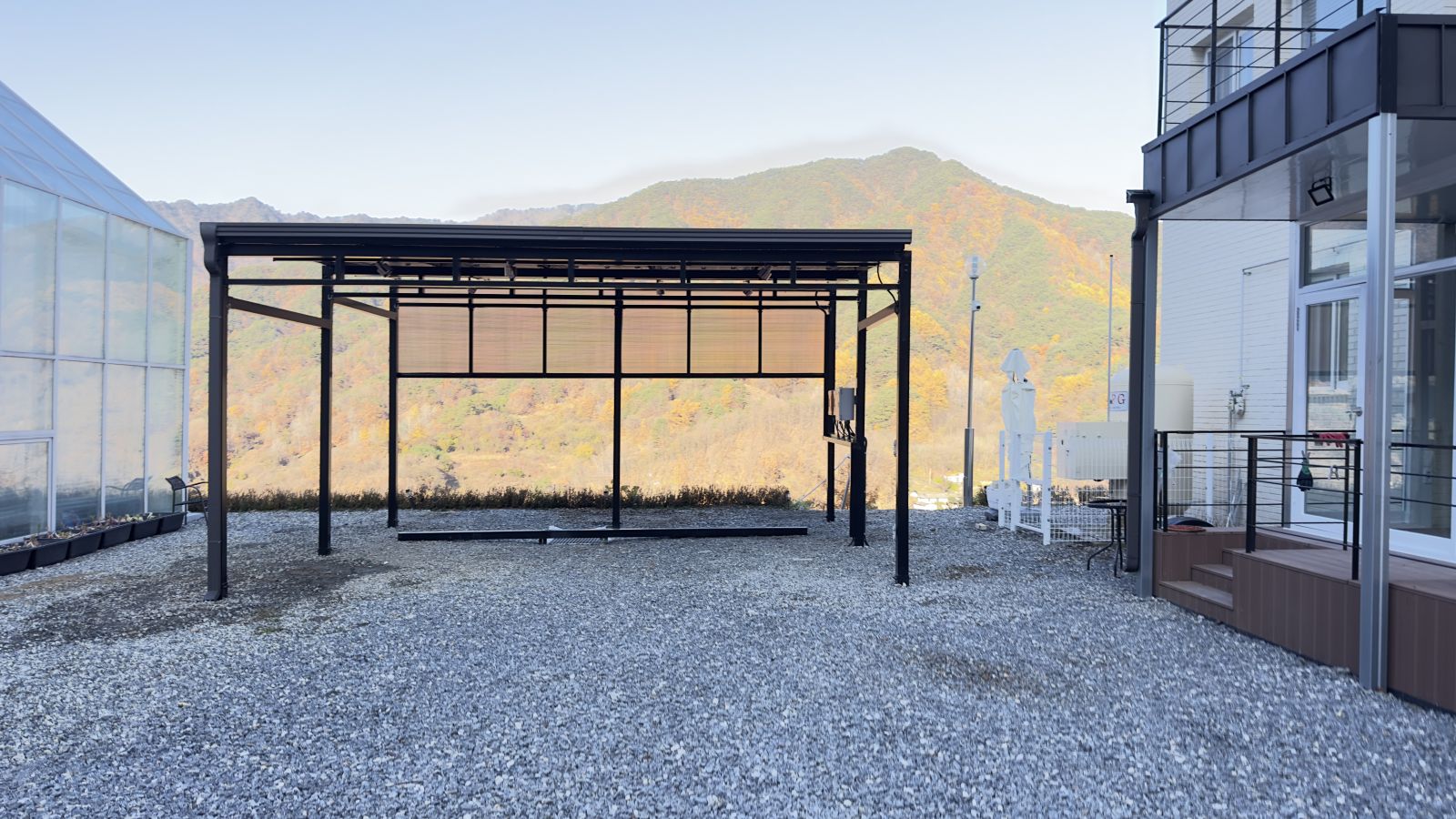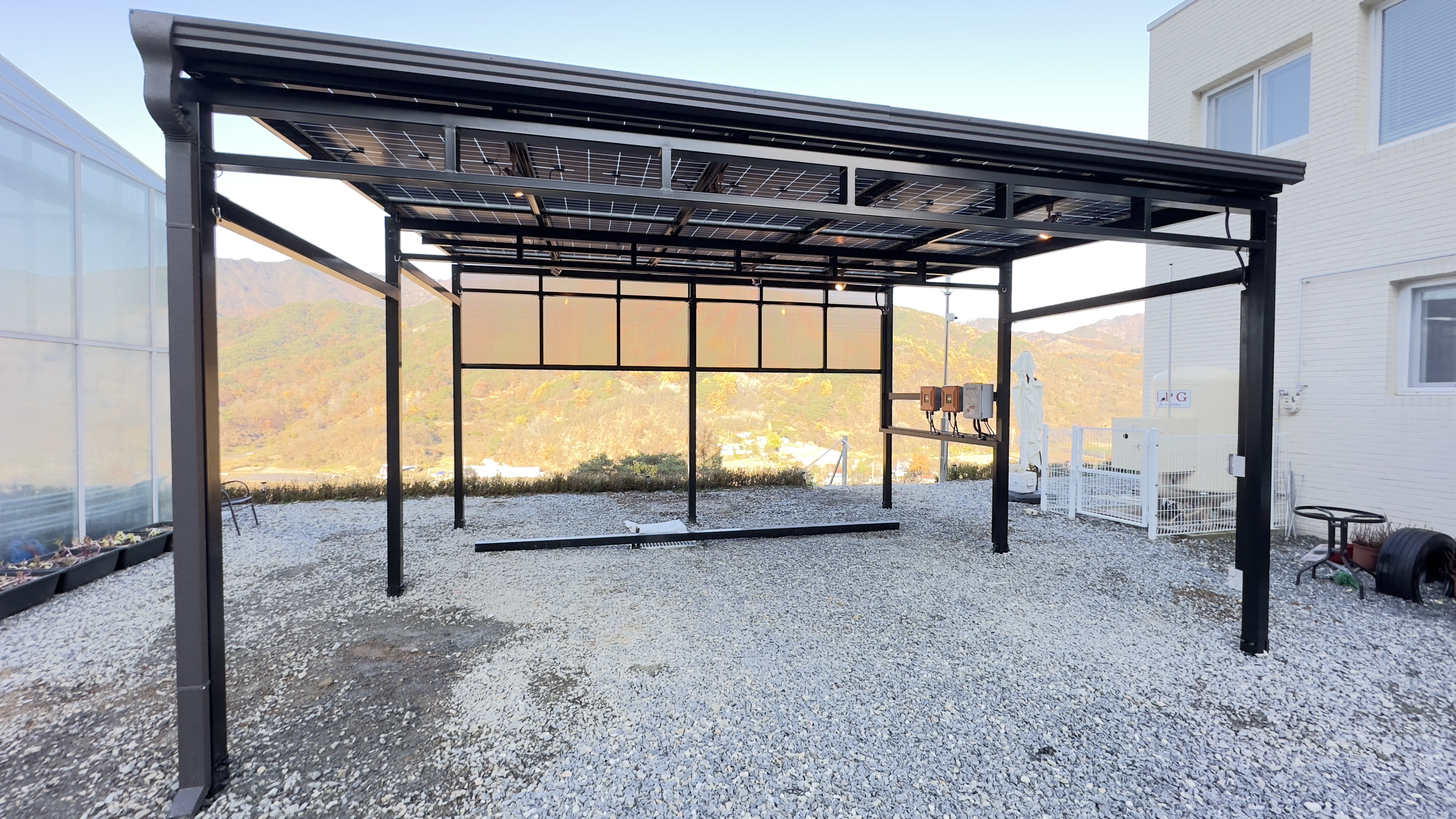 태양광주차장 설치가 완료되었습니다. 블랙의 구조물로 깔끔하고 웅장한 느낌마저 듭니다. 이번 현장에서는 썩지않는 방부목으로 인테리어 효과를 높였습니다.