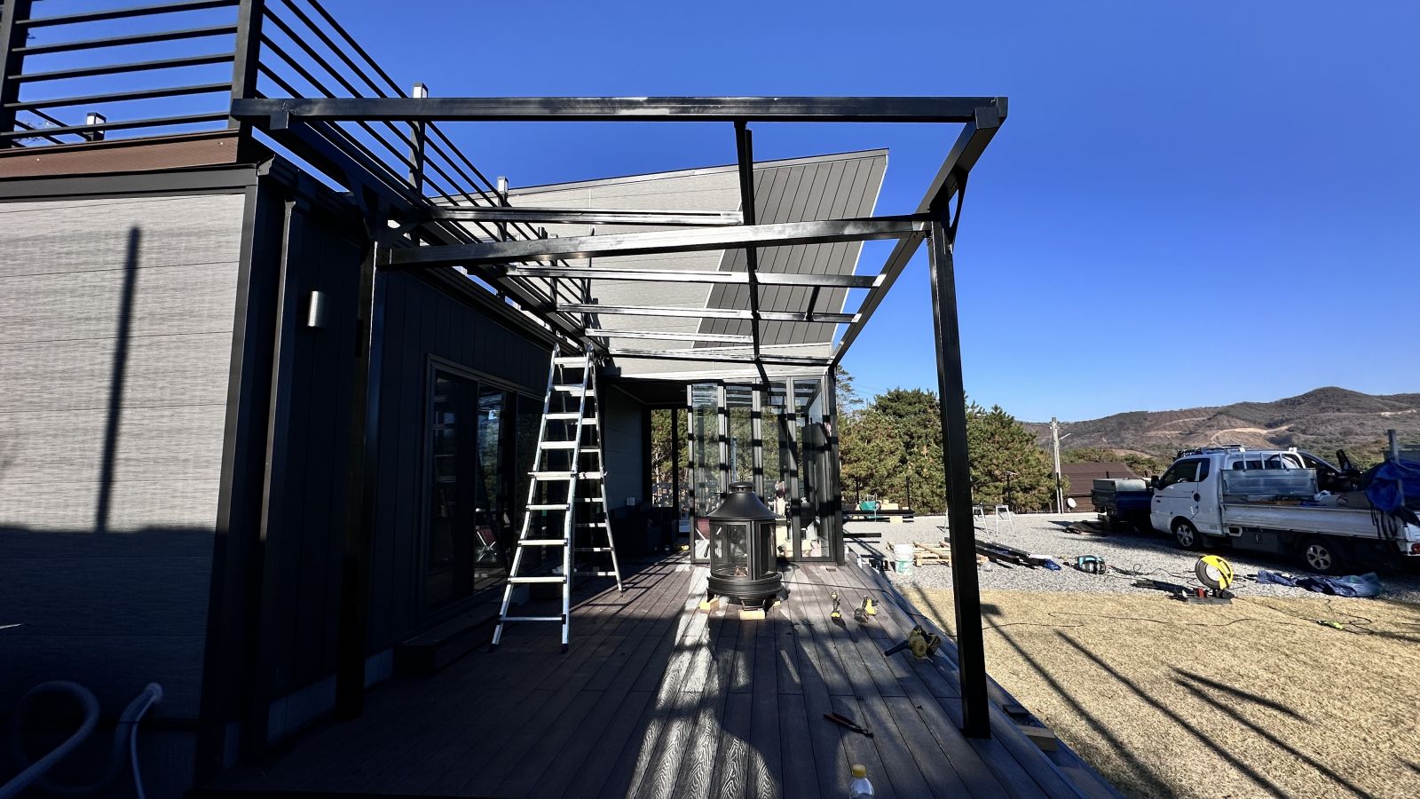 야간에 다용도 활용 면에서 최고급 LED 레일 등도 장착해 드렸습니다. 방수태양광이라 비나 눈이 와도 여유롭게 공간활용을 할수 있기에 가족 분들이 참 좋아하십니다. 빗물 받이를 위해 물받이도 시공 해드렸습니다. 인버터 시공