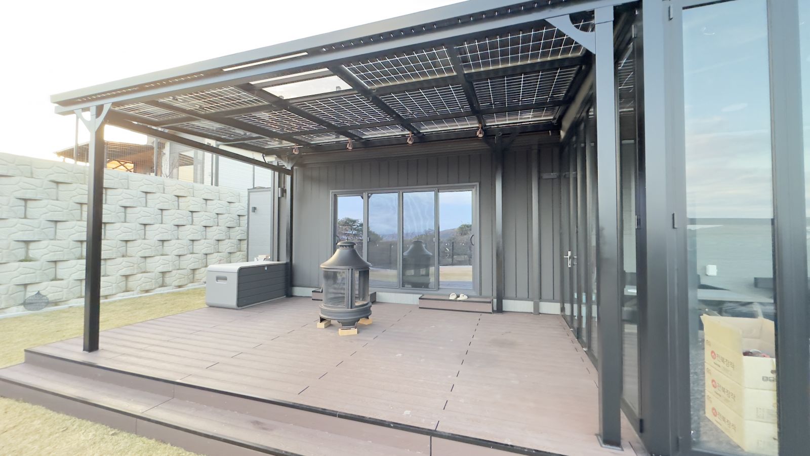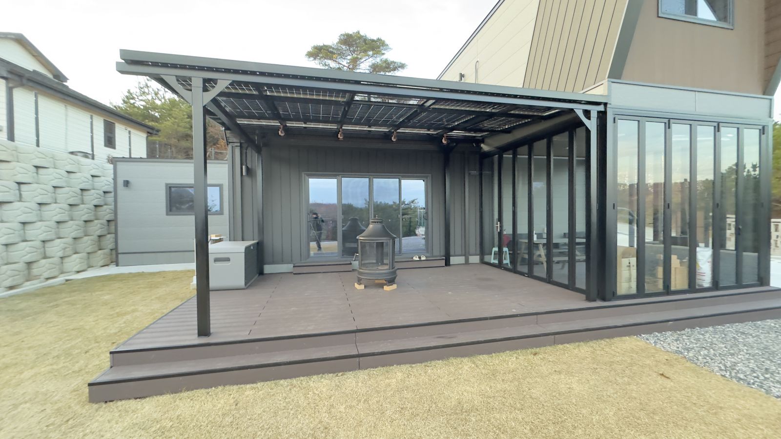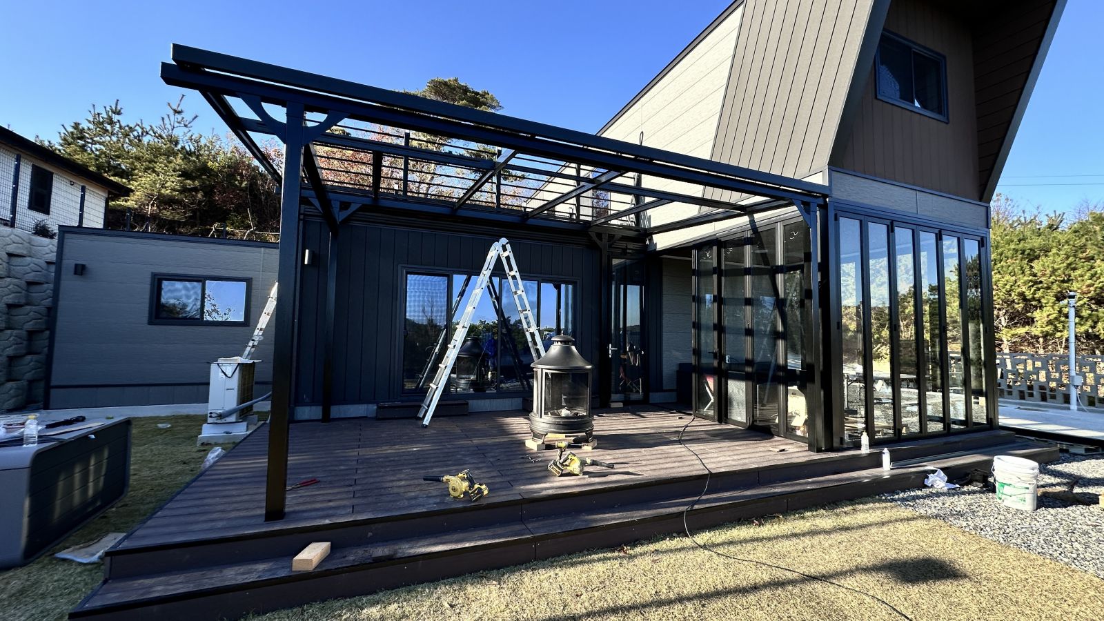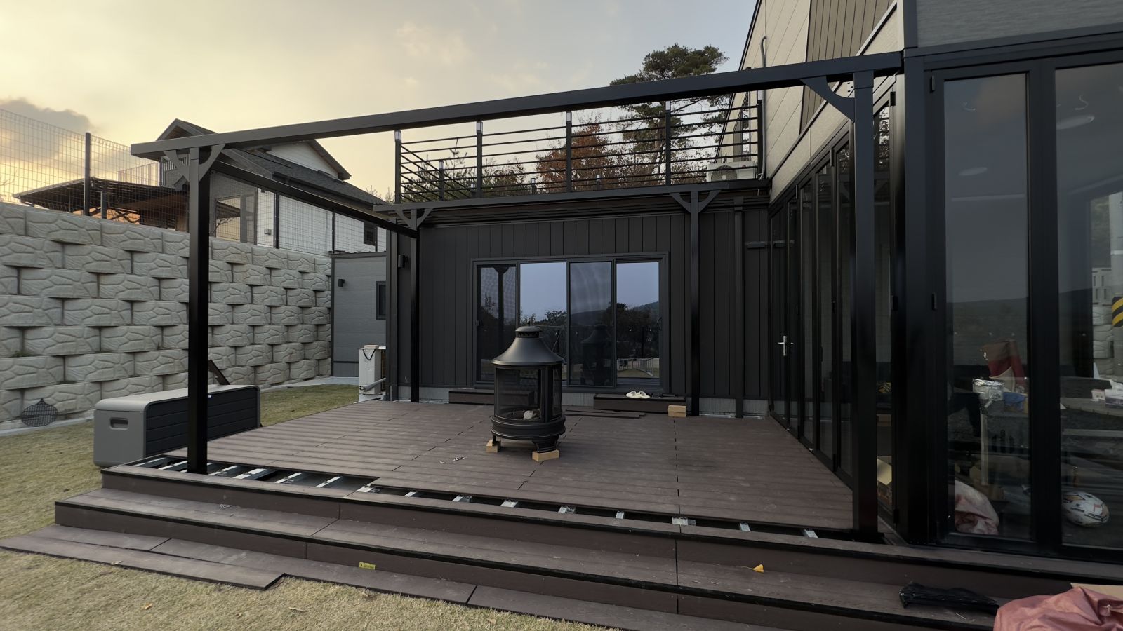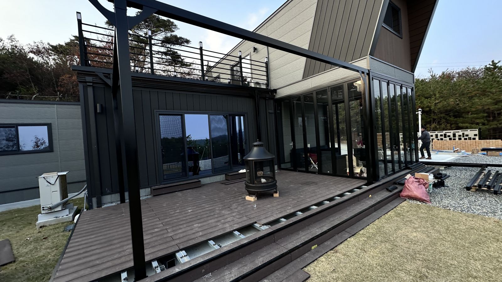 시공전의 전경입니다. 출입구 데크에 시공 예정입니다. 햇빛그늘막이 필요하고 비오는 날에도 넓은 데크를 사용할 수 있는 방법은 '태양광캐노피' 설치입니다.