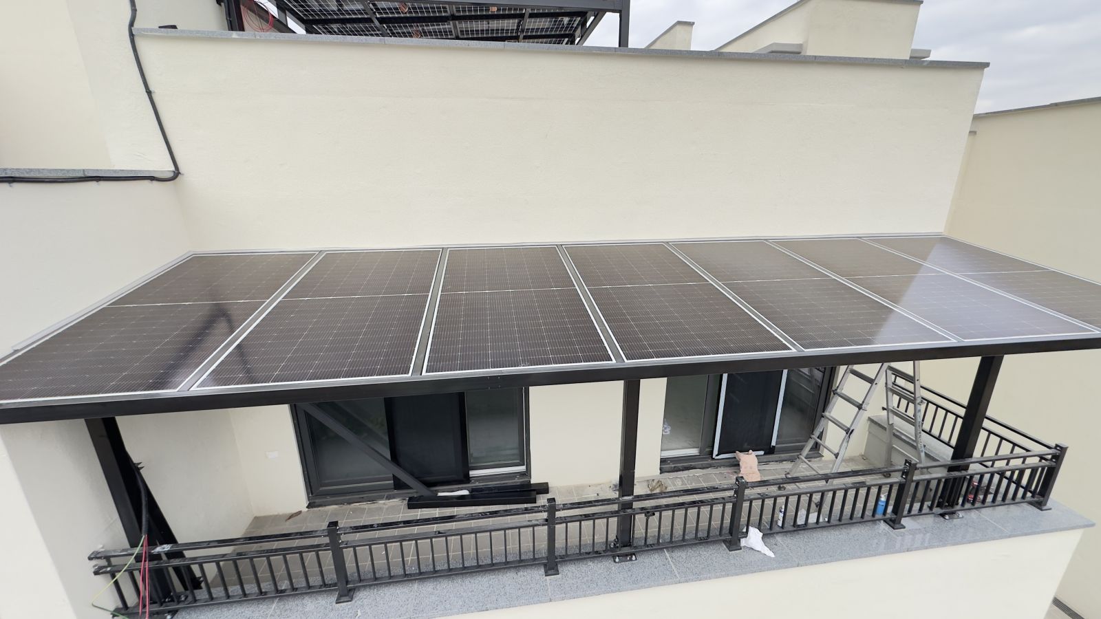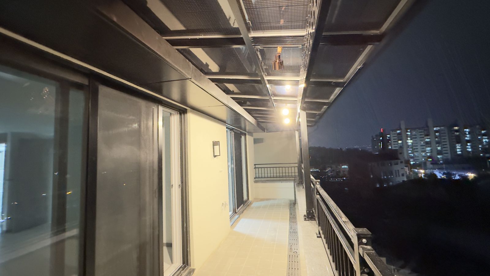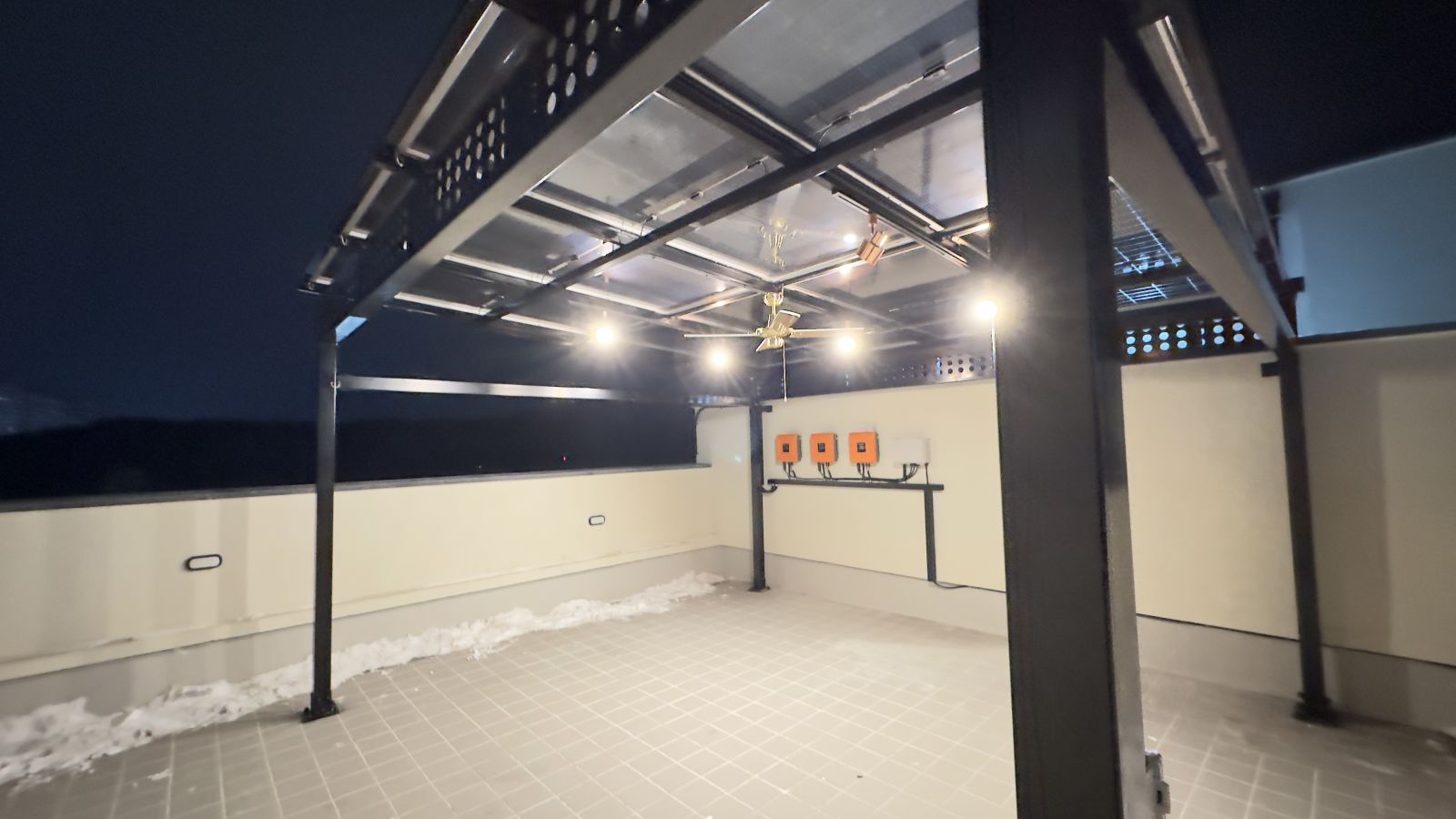 [테라스 태양광캐노피] 양면 그라스모듈 아래에 최고급 레일 등을 설치해서 저녁에는 환한 불빛으로 편리하게 생활하실 수 있습니다. ![]()