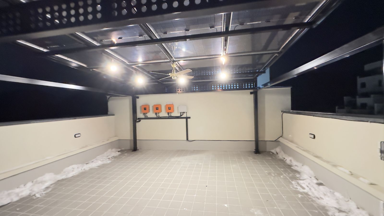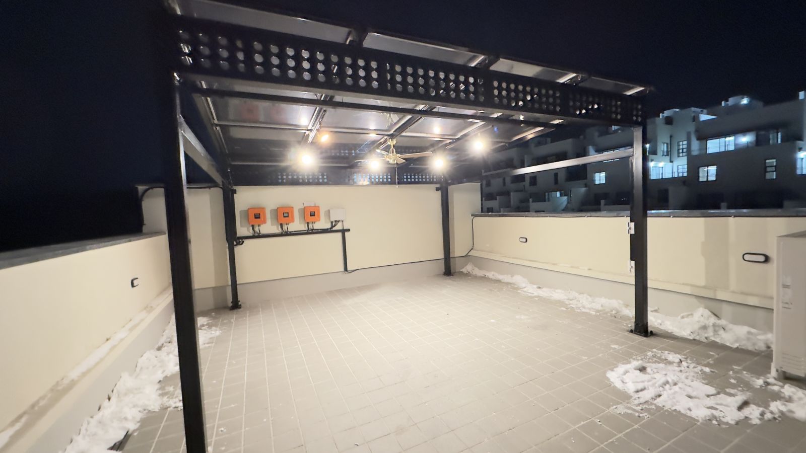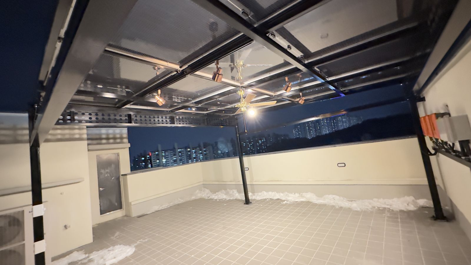 [테라스 태양광캐노피] 양면 그라스모듈 아래에 최고급 레일 등을 설치해서 저녁에는 환한 불빛으로 편리하게 생활하실 수 있습니다. ![]()