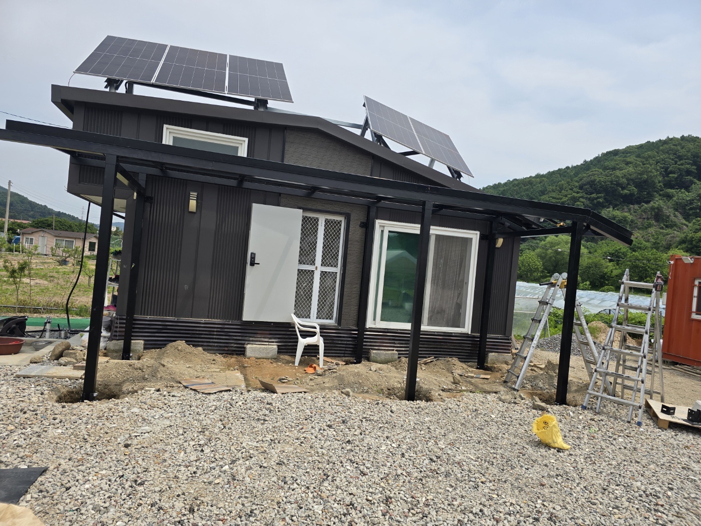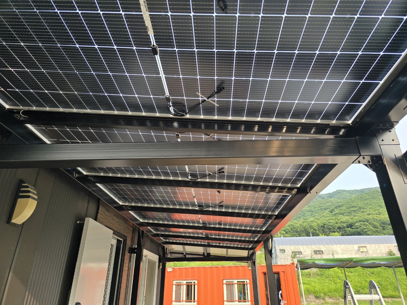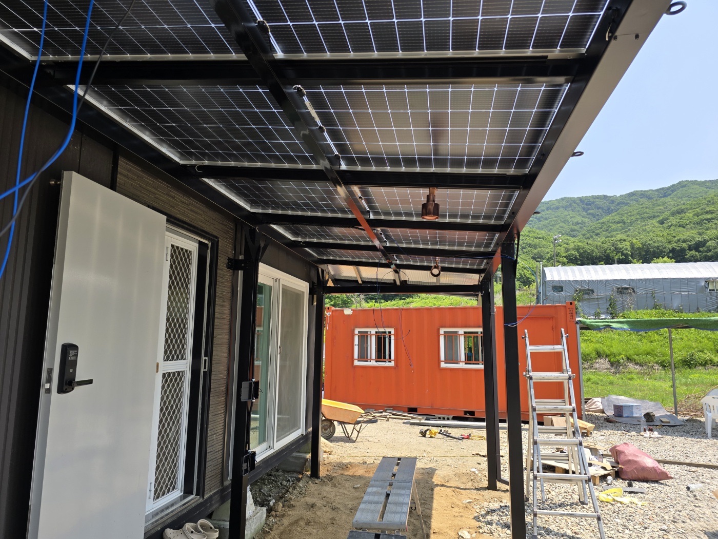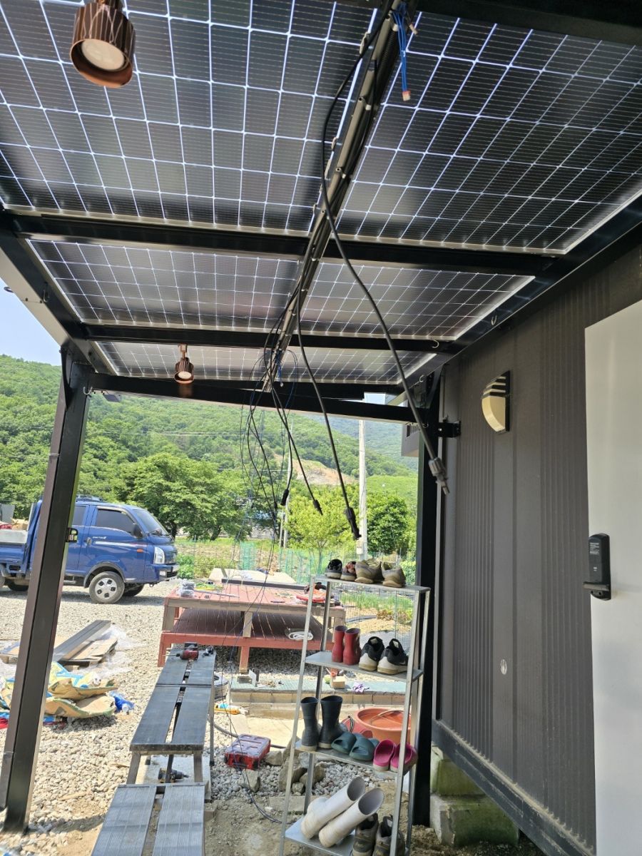 그리고 농막 정면에는 특별한 완전 방수 태양광 캐노피를 설치했습니다. 이렇게 두 가지 방식을 조합해서 농막에 필요한 전기를 충분히 생산할 수 있도록 하였습니다. ![]()