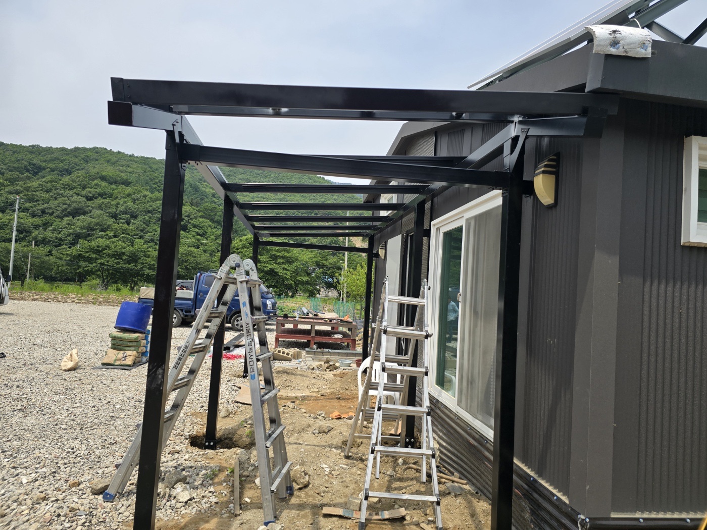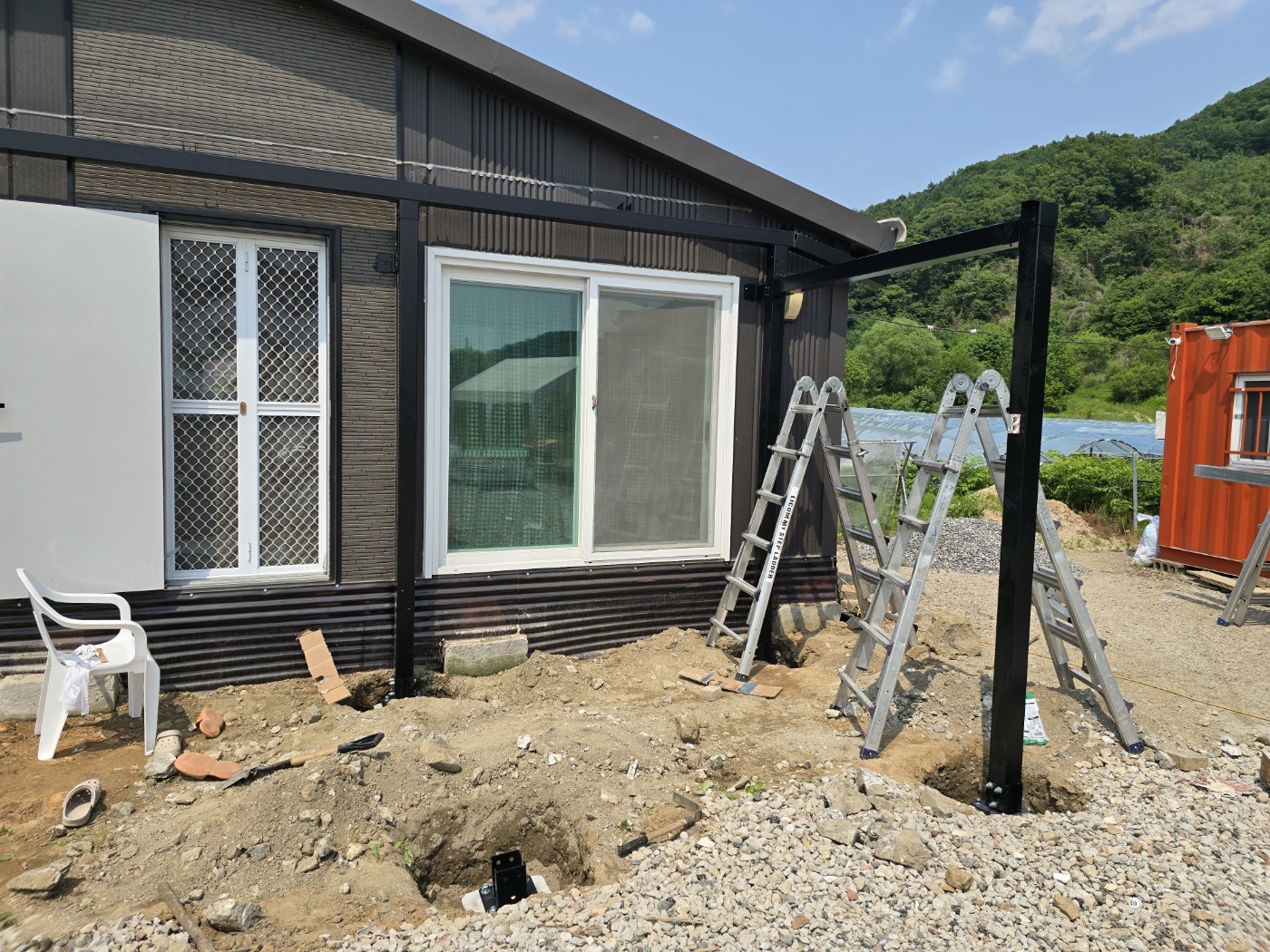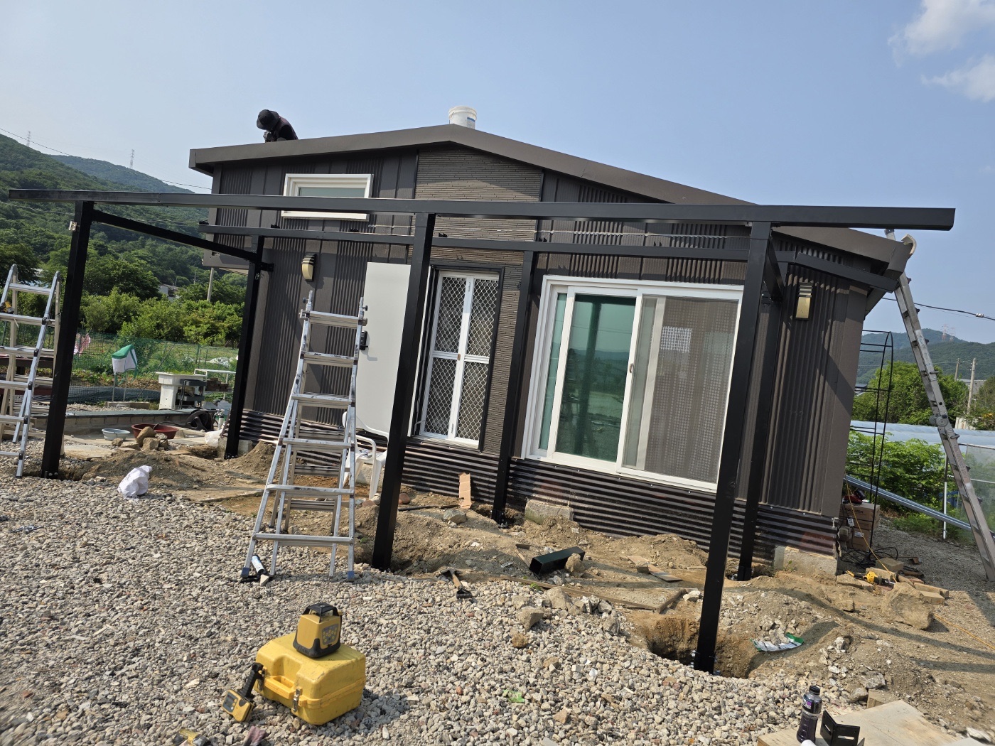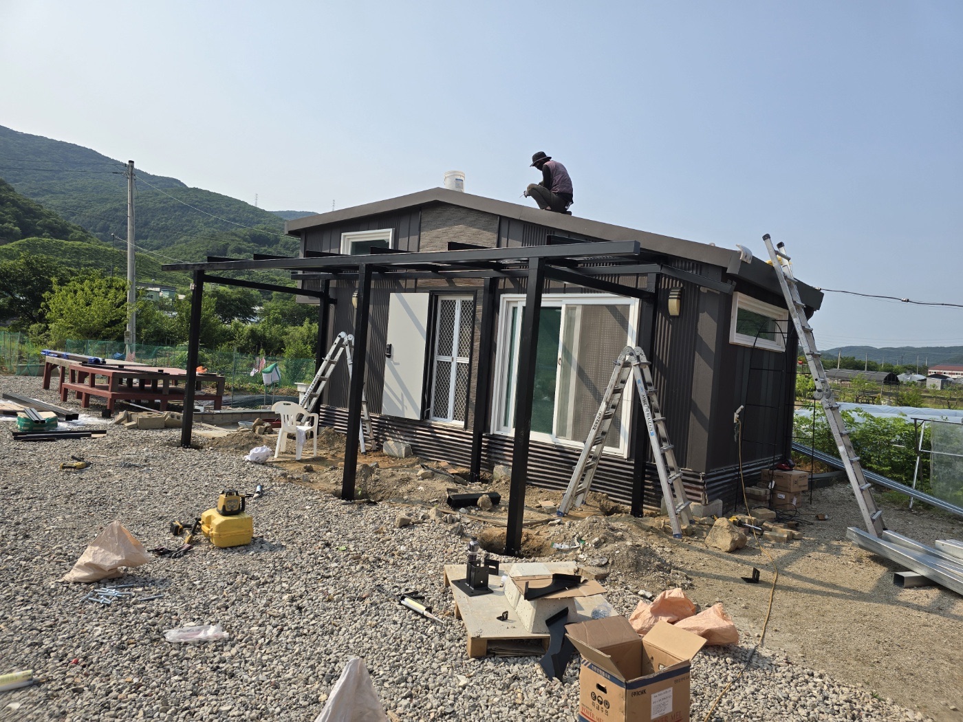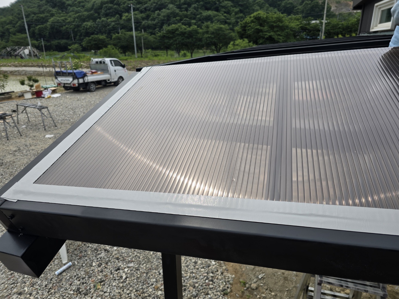 그리고 농막 정면에는 특별한 완전 방수 태양광 캐노피를 설치했습니다. 이렇게 두 가지 방식을 조합해서 농막에 필요한 전기를 충분히 생산할 수 있도록 하였습니다. ![]()