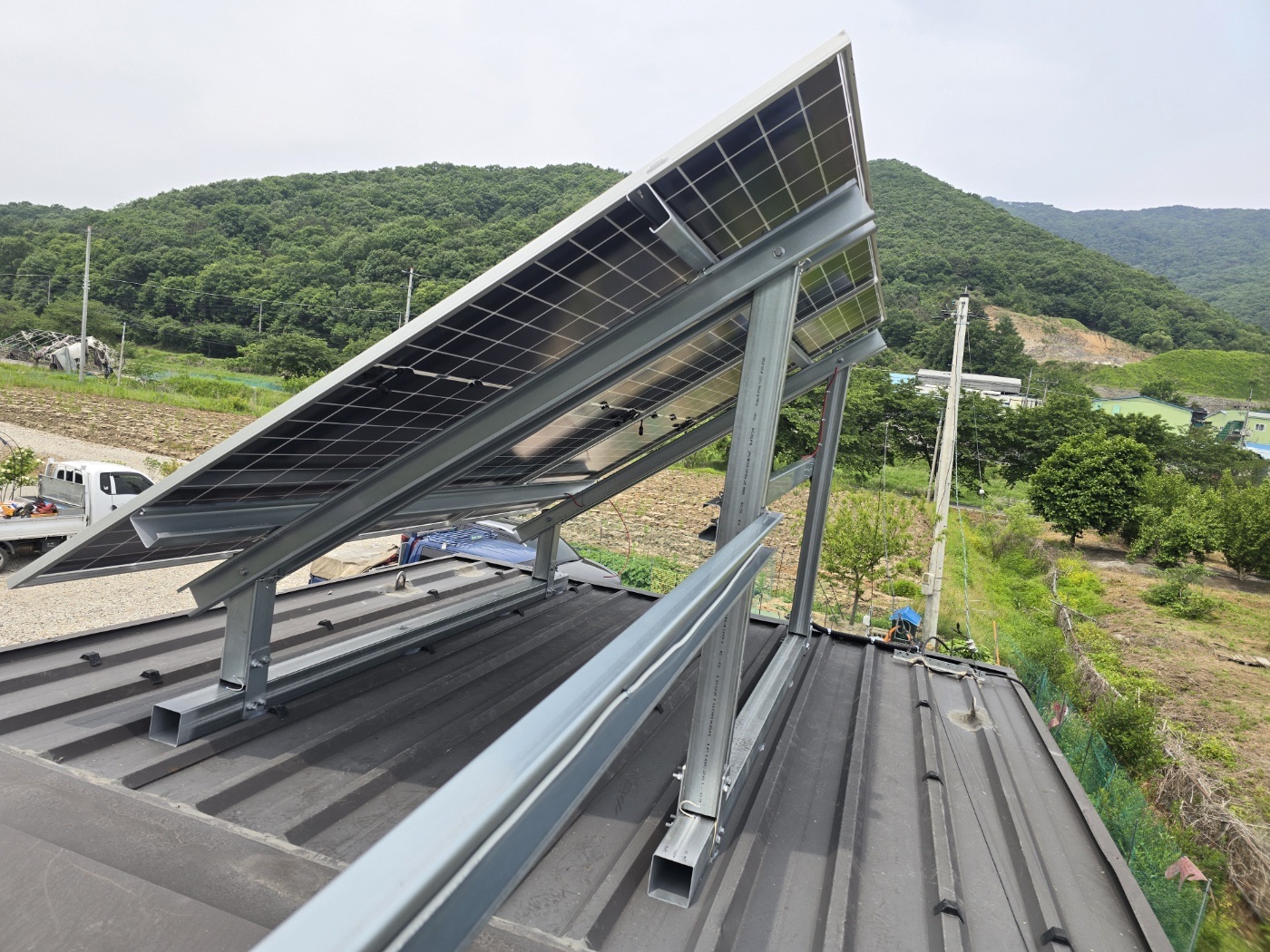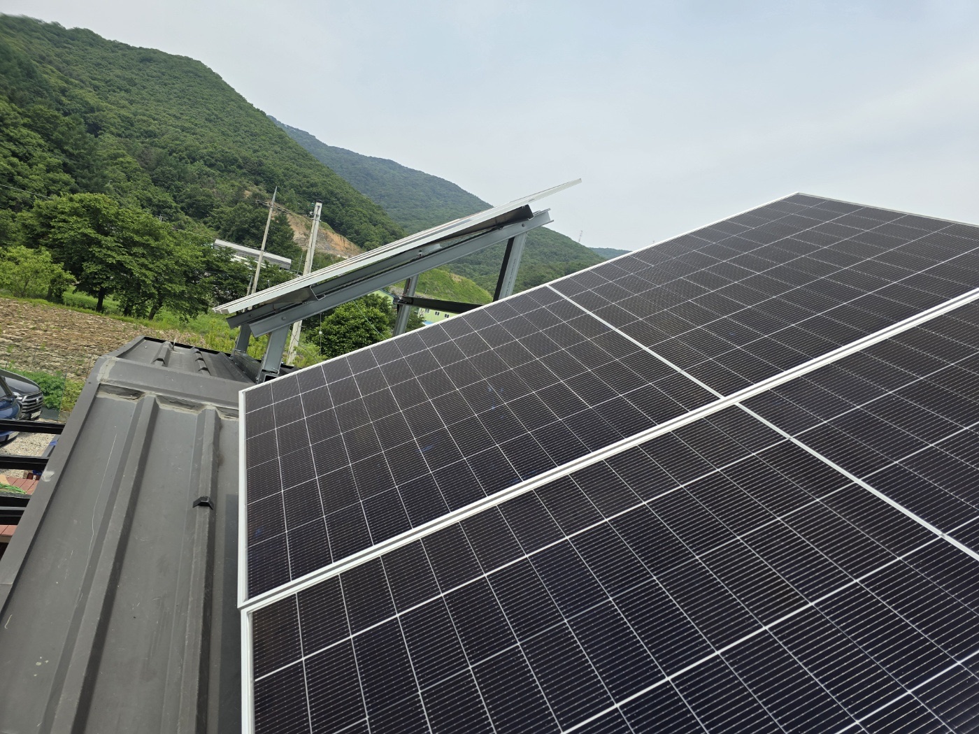 경기도 포천 농막에는 지붕형 태양광과 완전 방수 태양광 캐노피를 함께 설치했습니다. 지붕형 태양광은 지붕에 설치하는 방식인데요~ 지붕처럼 따로 방수가 필요 없는 곳에는 일반형 태양광을 설치합니다. ![]()