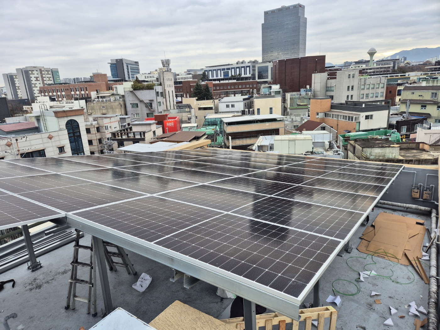 옥상에 태양광 구조물을 옮겨서 시공하고 태양광모듈을 설치합니다. 옥상태양광에도 양면그라스모듈을 사용합니다. 양면그라스모듈은 앞면뿐만 아니라 뒷면에서도 빛을 흡수하여 발전 효율을 높이는 태양광패널입니다. 기존 단면 태양광 모듈보다 발전량이 5~30% 증가하며, 내구성이 뛰어나 장기적인 수익성을 제공합니다. ![]()