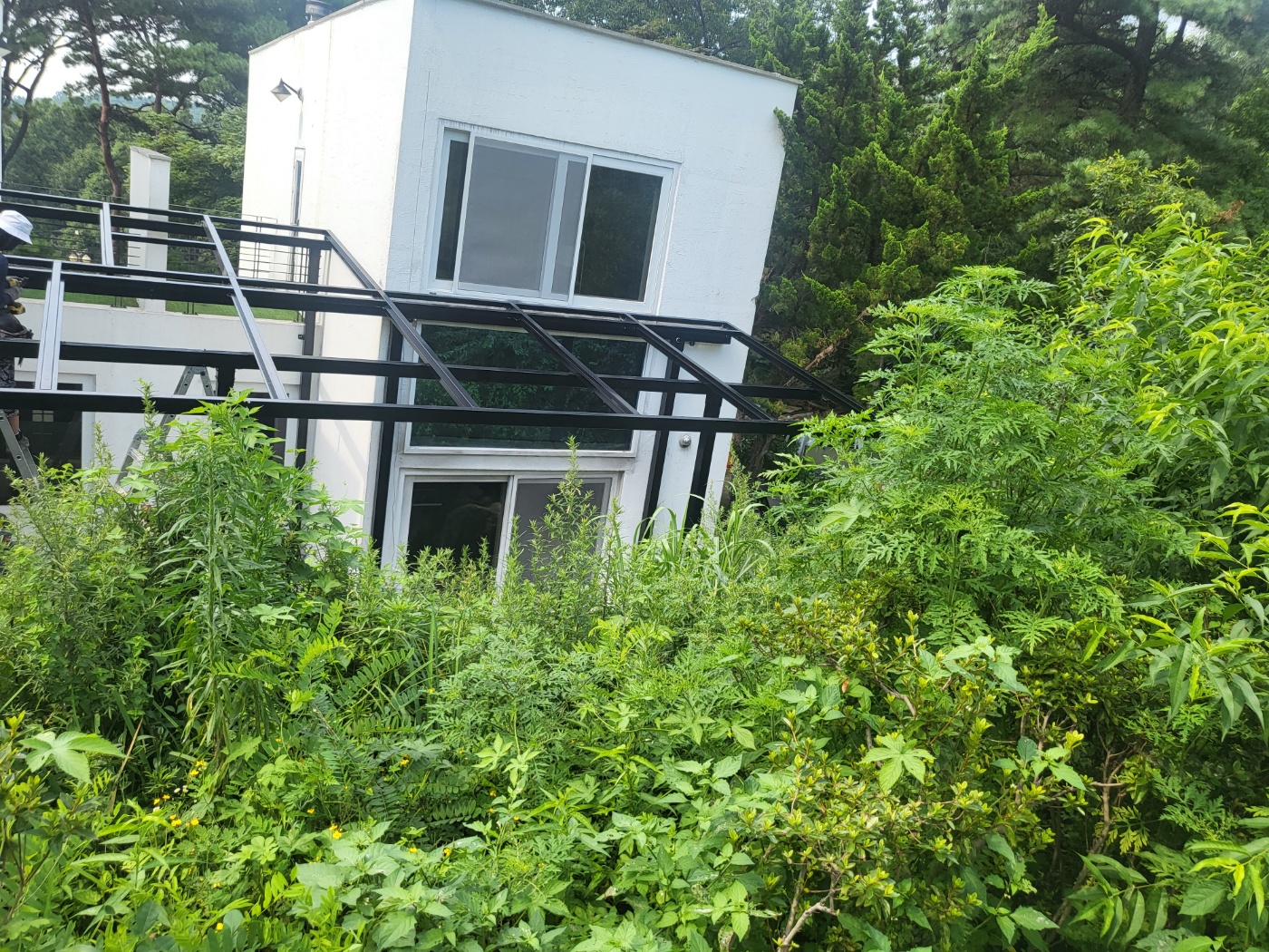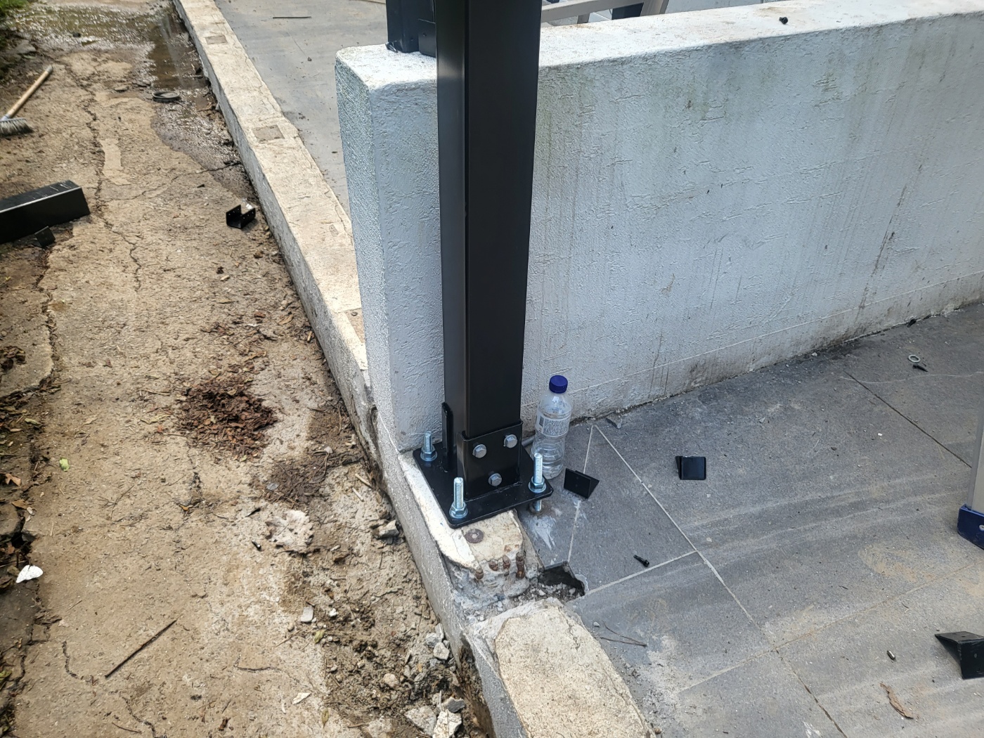 1층 야외에 있던 짐들을 마당으로 옮기고 태양광캐노피를 위한 구조물 시공을 준비합니다. 가장 중심이 되는 기둥작업을 위해 바닥을 파고 케미컬을 부어 단단히 고정을 시킨 후, 구조물들을 조립 설치합니다.
