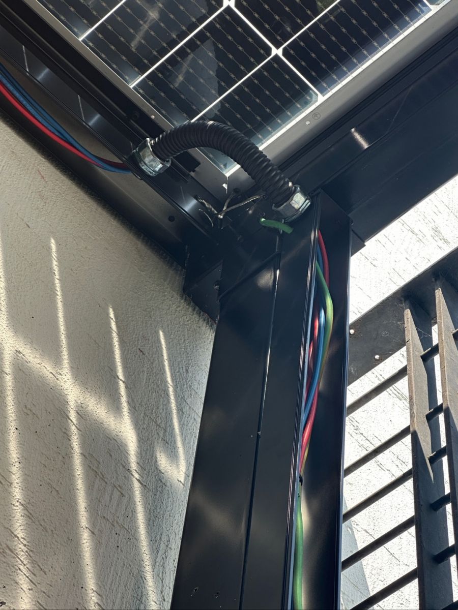 양면 모듈 아래로 실사용에 편리하도록 예쁜 포인트로 최고급 LED레일 등을 설치합니다. LED전선 등은 겉으로 보이지 않게 브라켓으로 마감처리합니다. 또, 빗물받이를 위해 물받이도 시공하였습니다. 인버터 시공