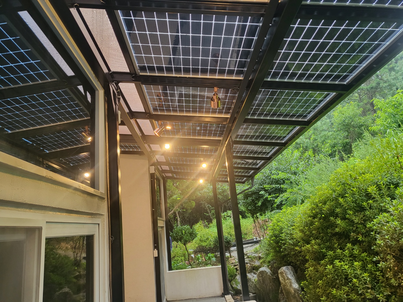 양면그라스 모듈 시공은 단면모듈에 비해 발전량이 높고 모듈 아래에서도 답답하지 않게 햇빛이 환하게 비치도록 설치됩니다.