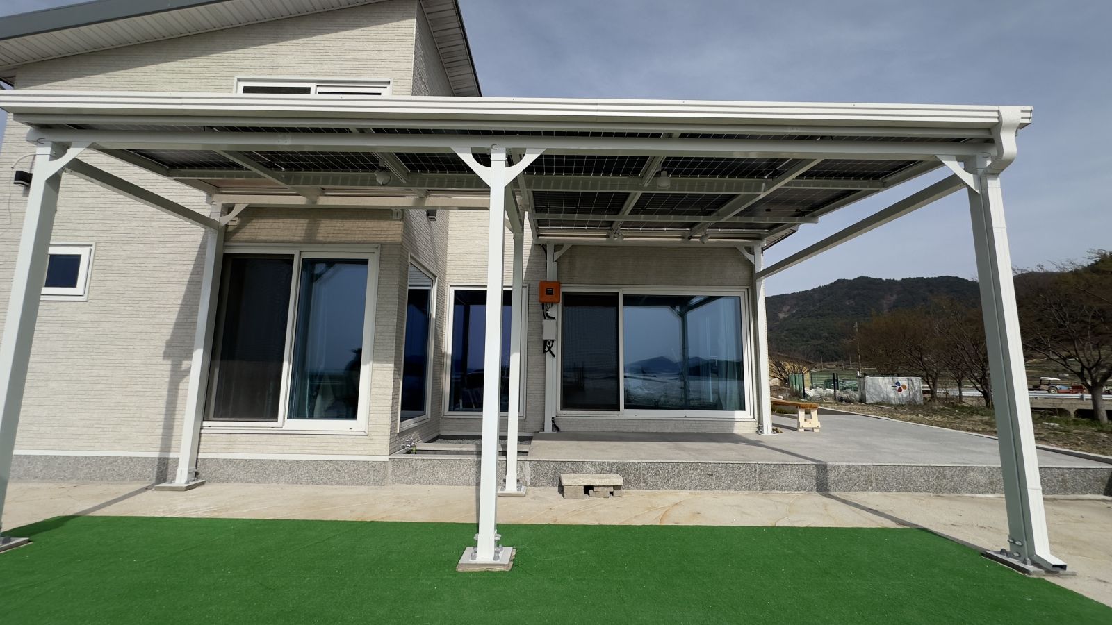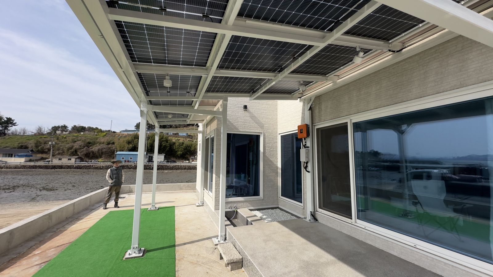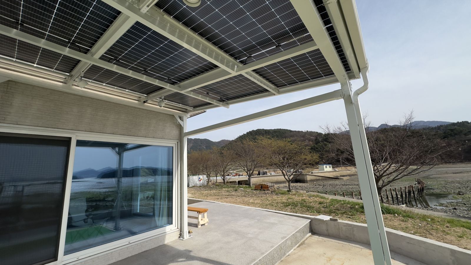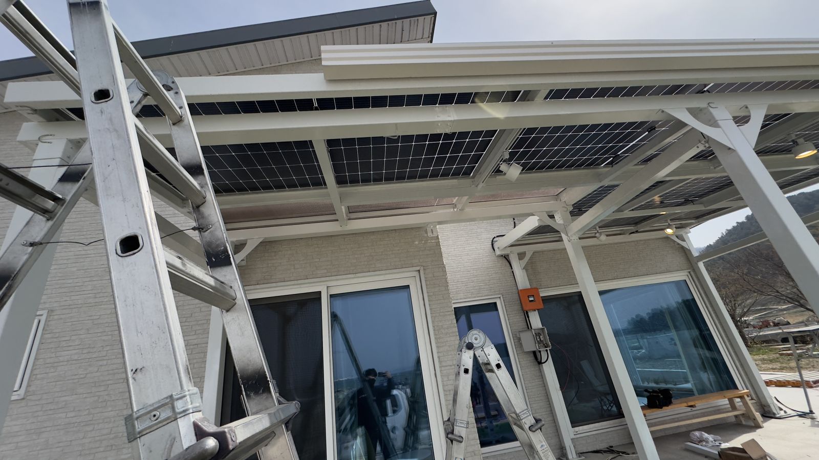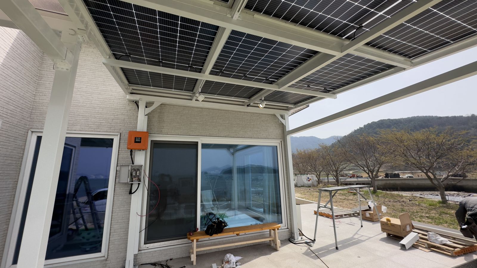 완성된 구조물 위에 태양광패널, 양면그라스모듈을 올립니다. 양면그라스모듈은 전면과 후면 모두 강화유리로 되어있는 구조의 태양광 모듈입니다. ![]()
