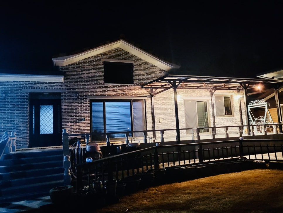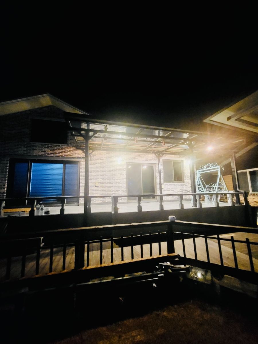 해가 지고 어두워지자, 준비해 두었던 LED 조명이 자동으로 켜졌습니다. 패널 아래쪽에 간접조명처럼 설치된 전등들이 은은하게 빛을 내면서, 테라스가 정말 멋진 야경 명소로 탈바꿈했습니다. 태양광 캐노피, 정말 만족스러웠어요!