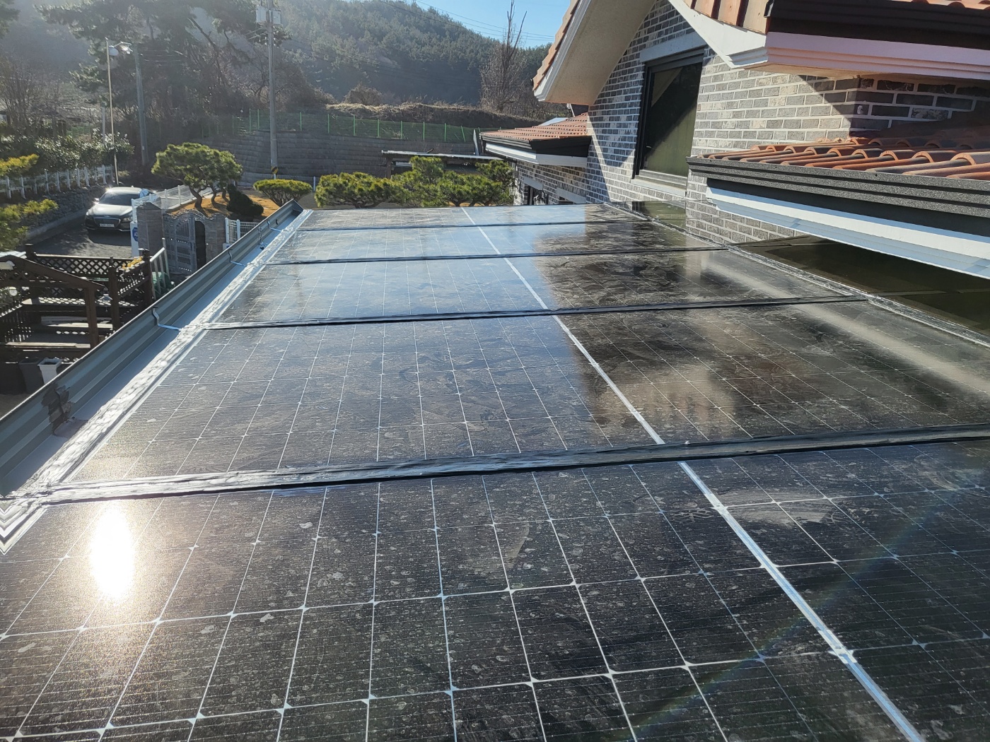 태양광 패널이 모두 설치된 후에는 전기 배선 작업과 방수 마감이 이뤄졌어요. 혹시나 빗물이 들어갈 수 있는 틈은 없는지 꼼꼼히 확인하고, 실리콘으로 빈틈을 막아주는 작업까지 마무리했습니다.