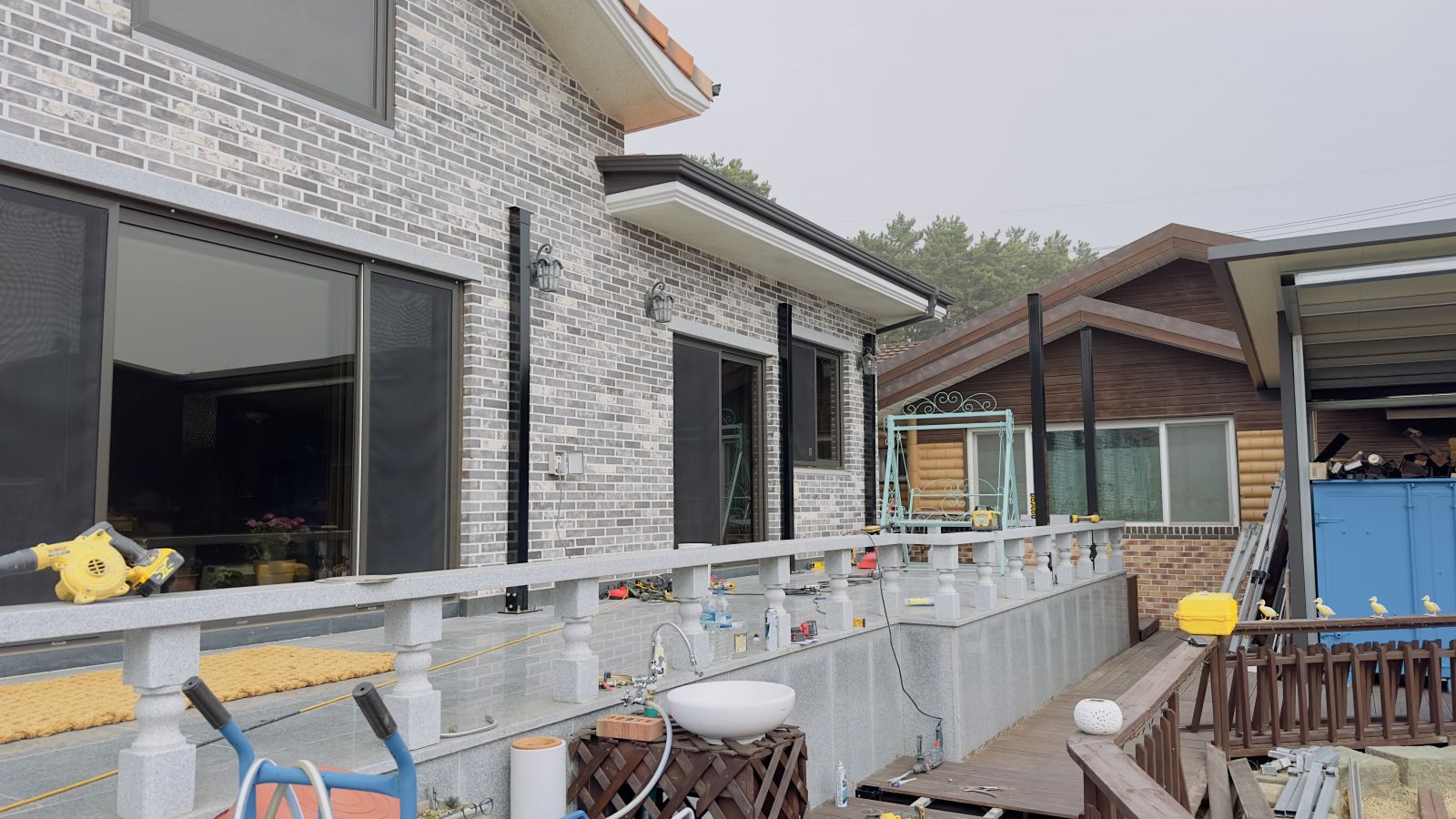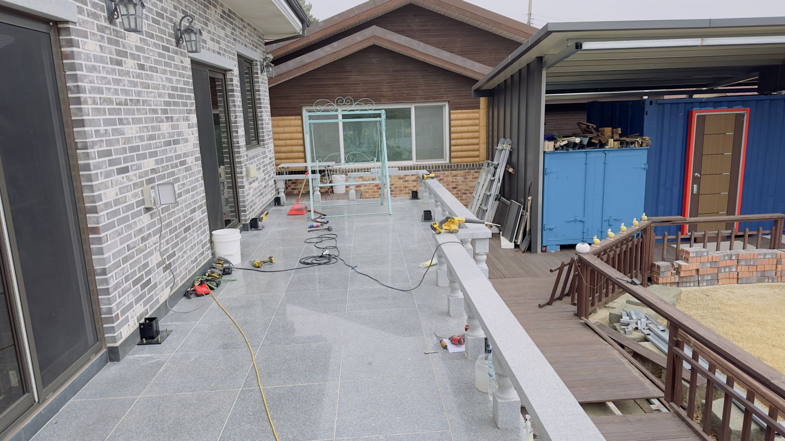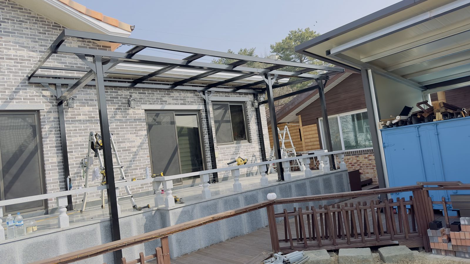 처음 시작은 아주 단단한 기초부터입니다. 테라스 바닥에 정확한 위치를 잡고, 튼튼한 각파이프 철제 기둥들을 하나씩 세워나갑니다. 이때 중요한 건 기둥이 삐뚤어지지 않게 정확히 수직으로 맞추는 것입니다. ![]()