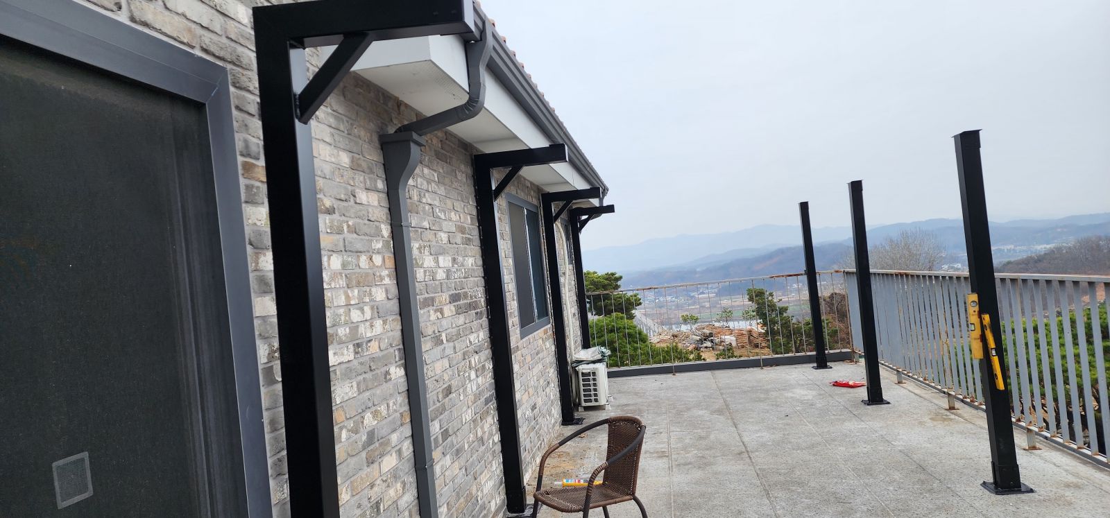 태양광캐노피 시공전의 모습입니다. 출입구 데크가 앞면을 가득 채우고 있습니다. 햇빛그늘막이 필요하고 비오는 날에도 넓은 데크를 사용할 수 있는 방법은 '태양광캐노피' 설치입니다. 3D동영상 무료견적