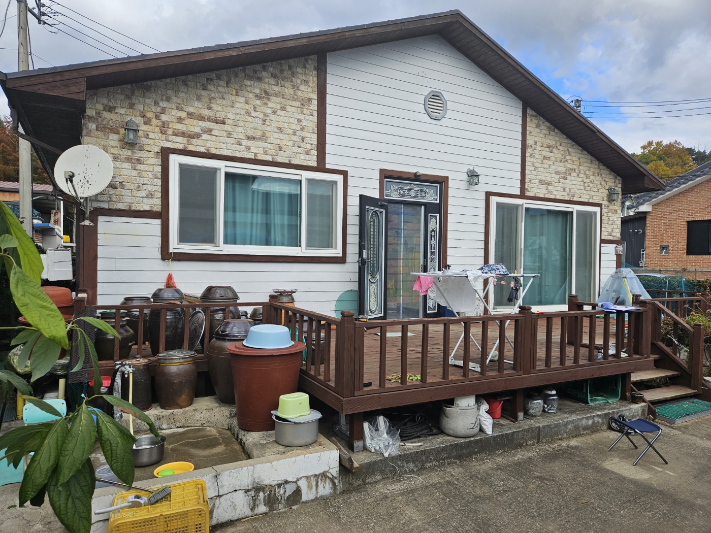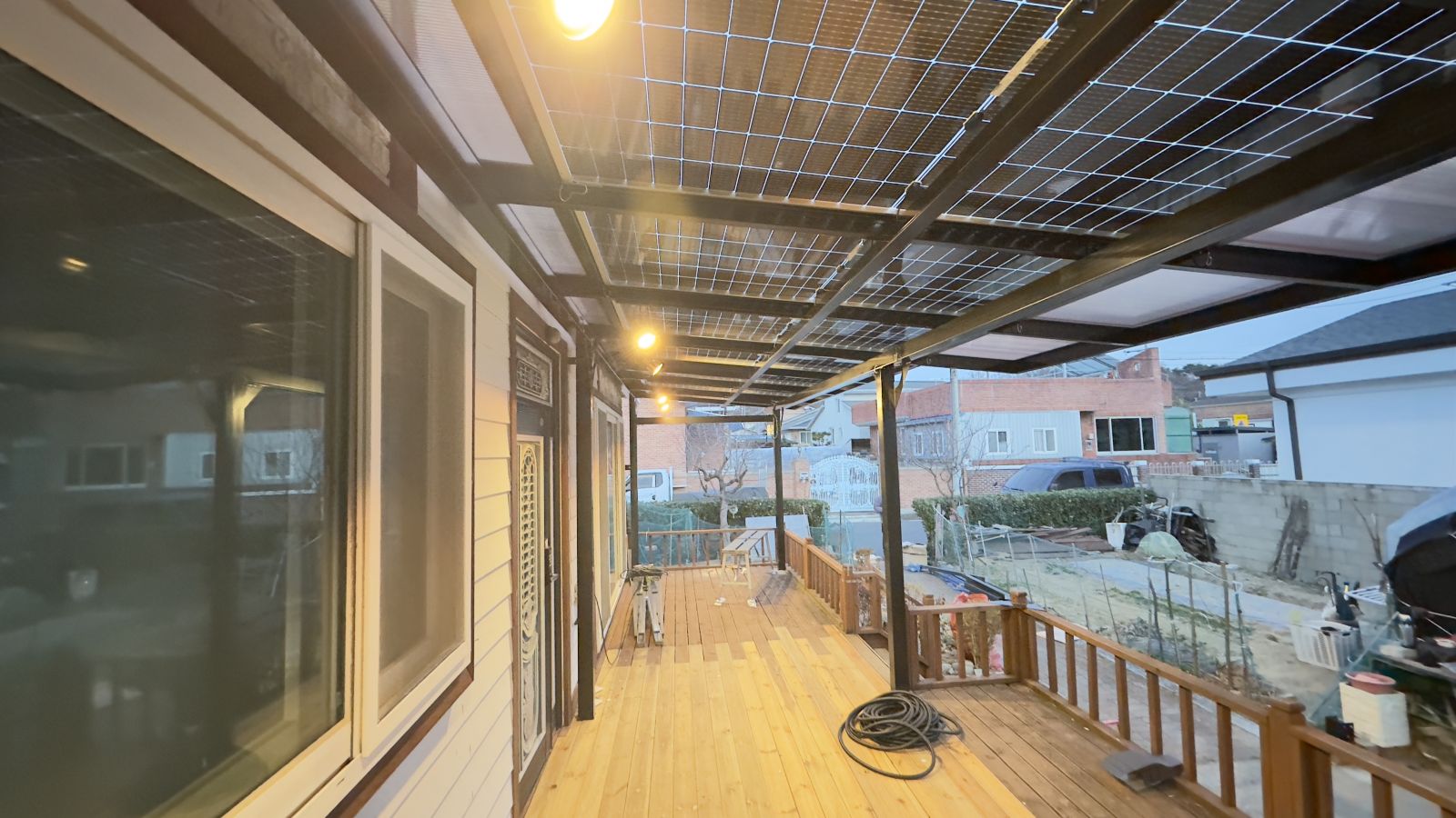 태양광캐노피 시공전의 모습입니다. 출입구 데크가 앞면을 가득 채우고 있습니다. 햇빛그늘막이 필요하고 비오는 날에도 넓은 데크를 사용할 수 있는 방법은 '태양광캐노피' 설치입니다. 3D동영상 무료견적