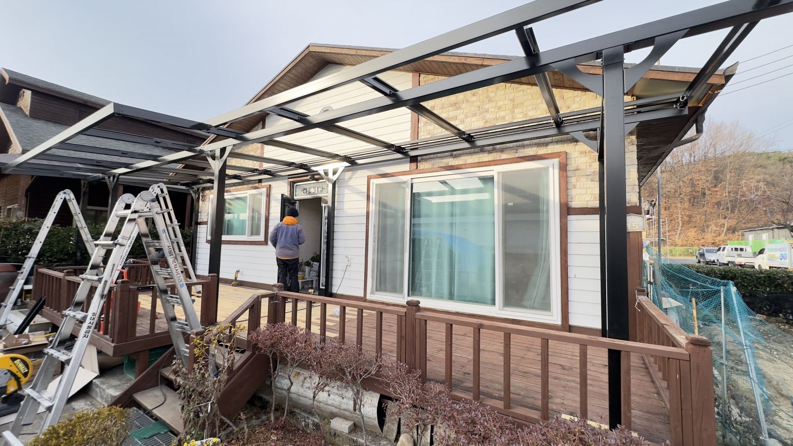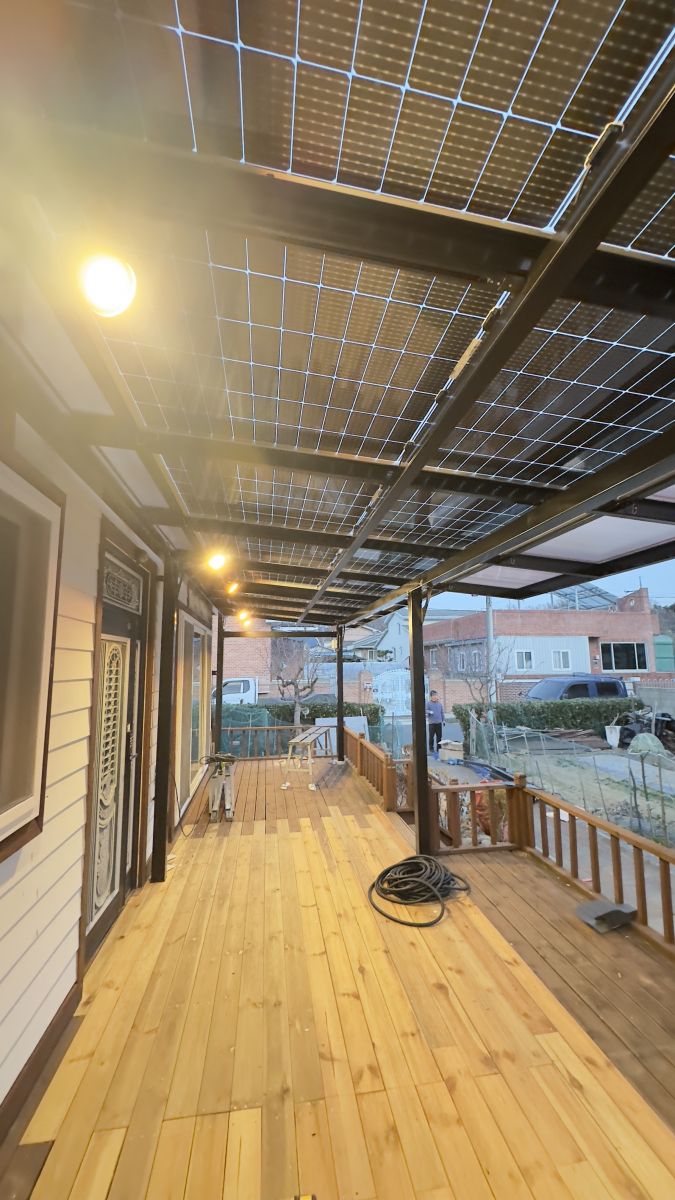 야간에 다용도 활용 면에서 최고급 LED 레일 등도 장착해 드렸습니다. 방수태양광이라 비나 눈이 와도 여유롭게 공간활용을 할수 있기에 가족 분들이 참 좋아하십니다. 빗물 받이를 위해 물받이도 시공 해드렸습니다. 인버터 시공