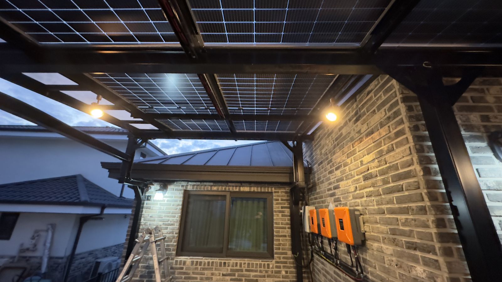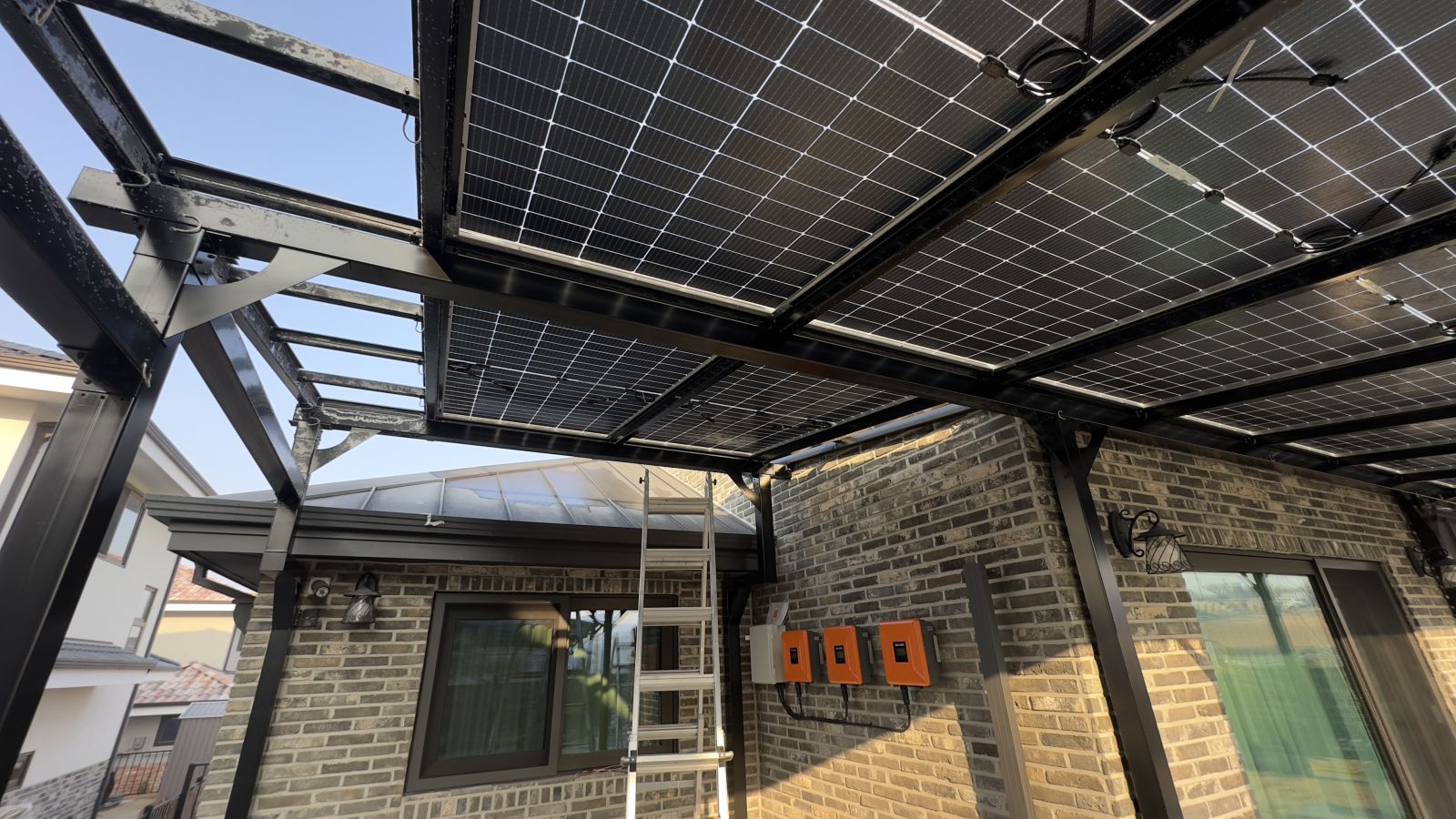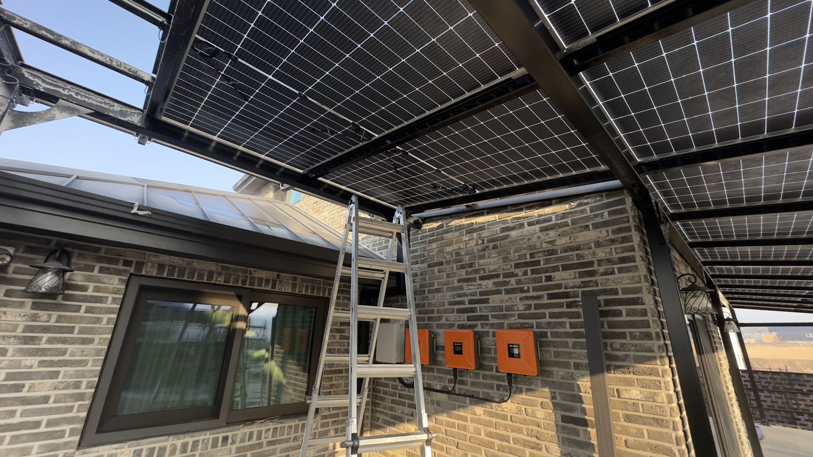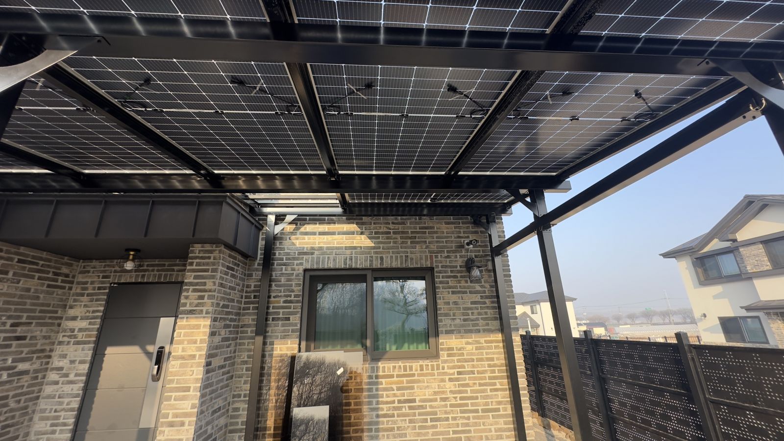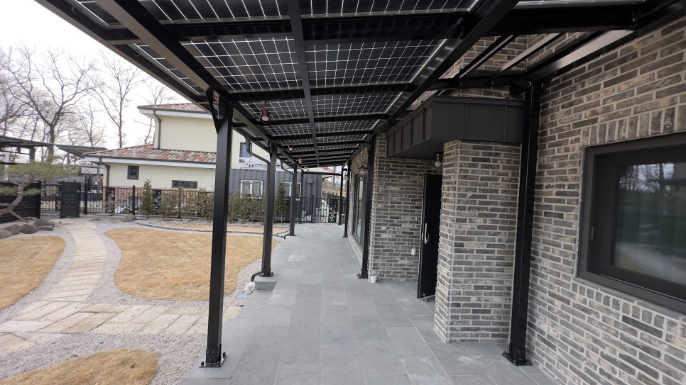 태양광인버터를 건물 외벽에 설치했습니다. 양면그라스 모듈은 일반모듈보다 생산이 높아 인버터를 설치하여 전기요금을 절약하실 수 있습니다. ![]() ![]() ![]() 태양광발전의 대표주자 "태양광캐노피"가 완공되었습니다. 처음 전원주택에 도착했을 때도 워낙에 넓고 깨끗하게 관리하고 계시고 웅장해서 '우와~~' 하고 탄성을 했는데요~ ![]() ![]() ![]() 태양광캐노피를 1층 전면부 전체에 블랙 색상으로 시공을 마치고나니 전원주택이 더 세련되고 멋있다는 말이 저절로 나왔습니다.