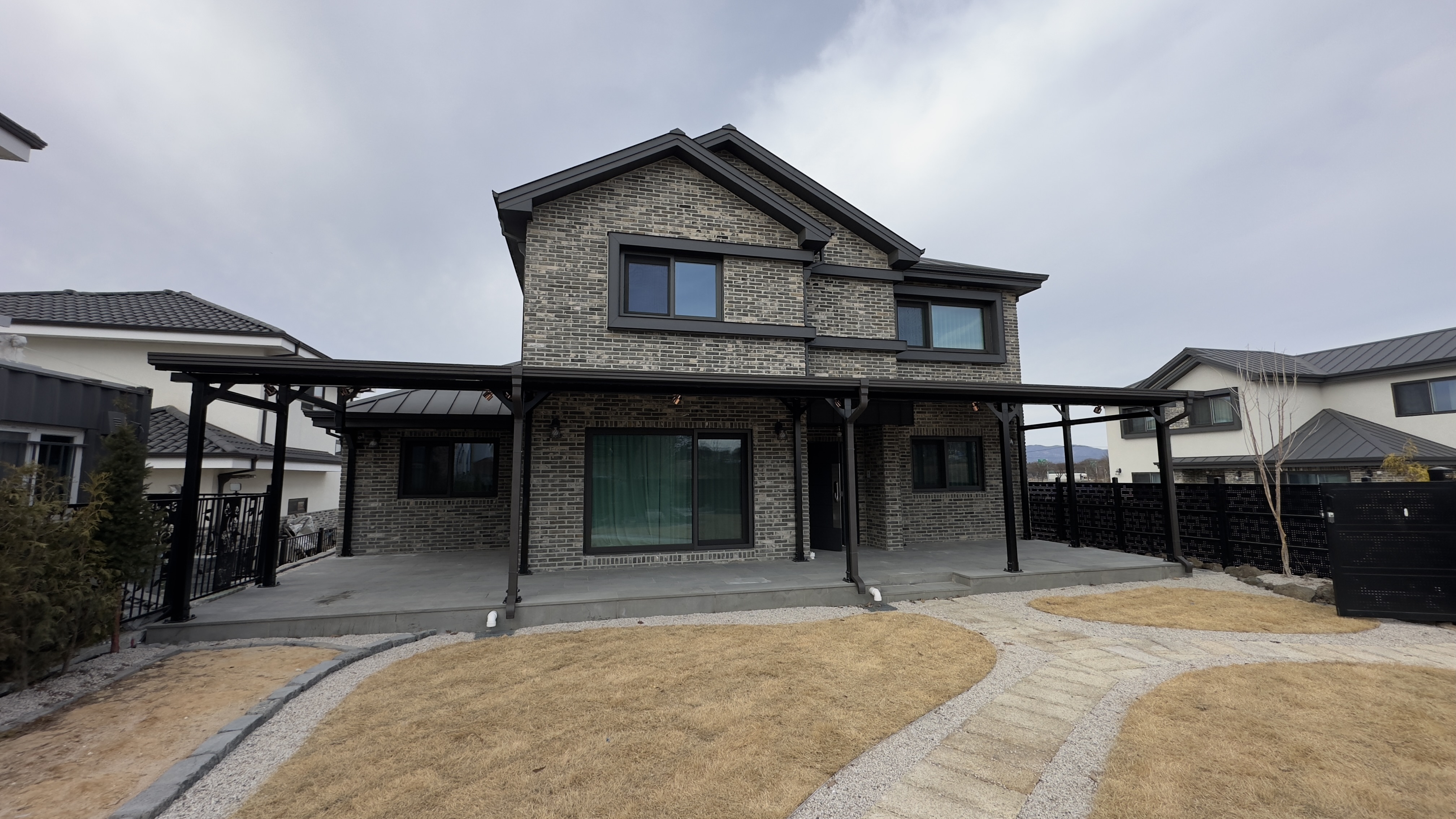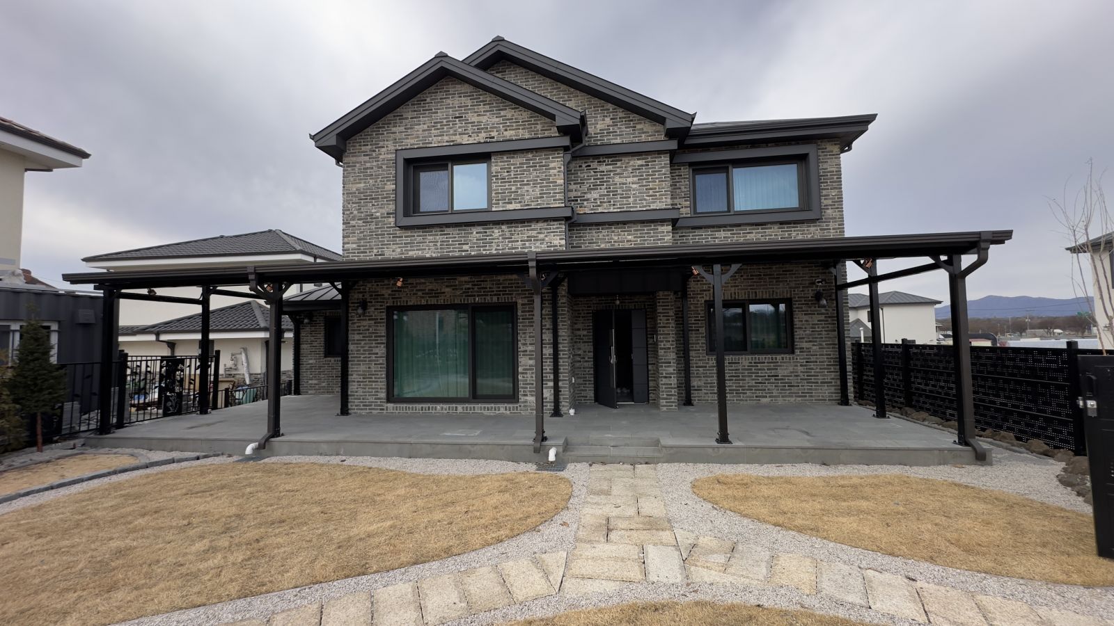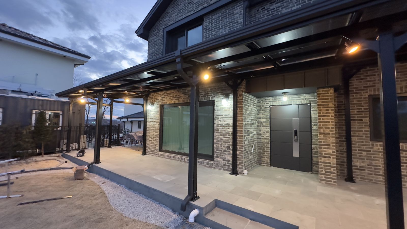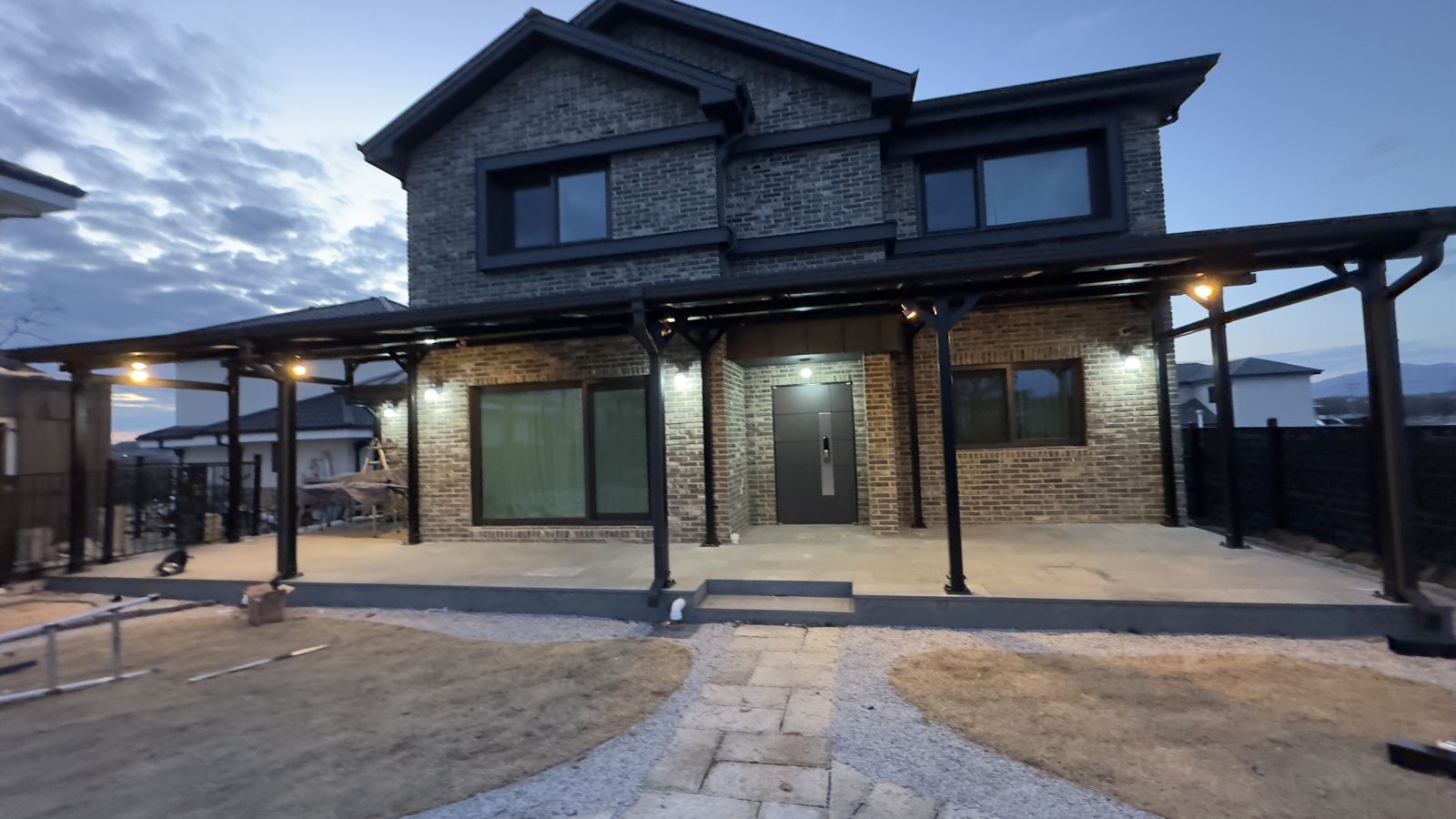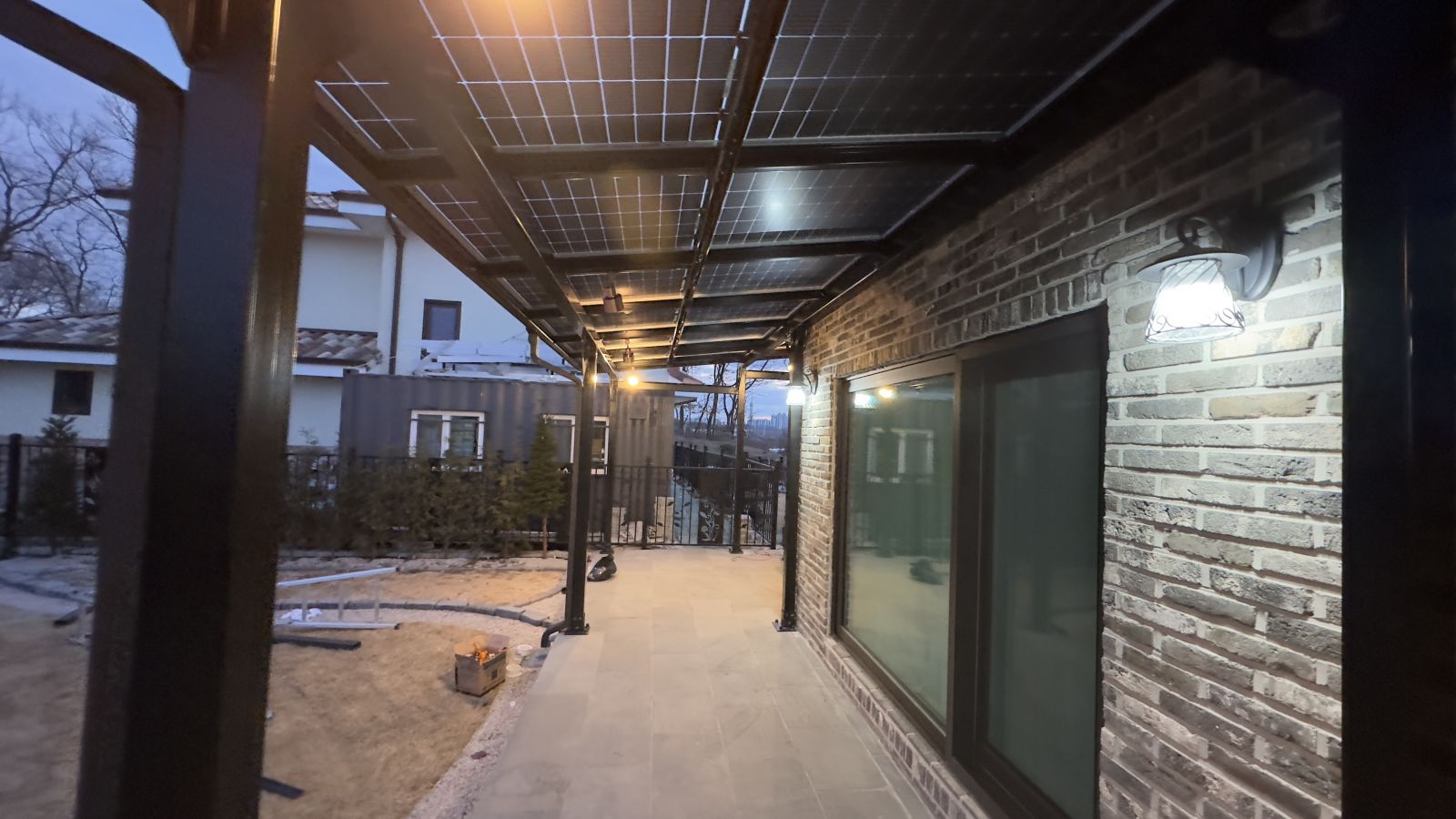 태양광인버터를 건물 외벽에 설치했습니다. 양면그라스 모듈은 일반모듈보다 생산이 높아 인버터를 설치하여 전기요금을 절약하실 수 있습니다. ![]() ![]() ![]() 태양광발전의 대표주자 "태양광캐노피"가 완공되었습니다. 처음 전원주택에 도착했을 때도 워낙에 넓고 깨끗하게 관리하고 계시고 웅장해서 '우와~~' 하고 탄성을 했는데요~ ![]() ![]() ![]() 태양광캐노피를 1층 전면부 전체에 블랙 색상으로 시공을 마치고나니 전원주택이 더 세련되고 멋있다는 말이 저절로 나왔습니다.