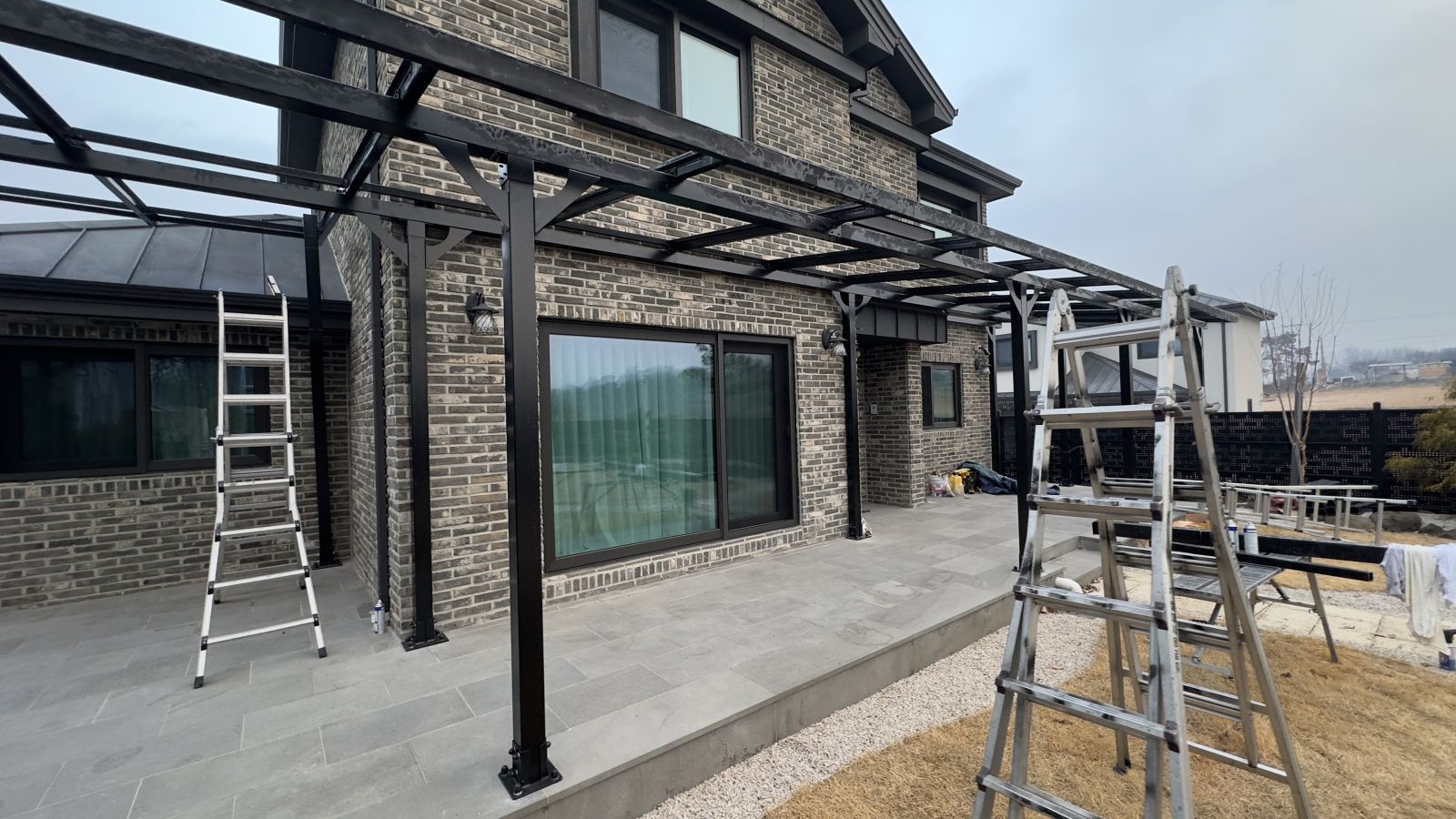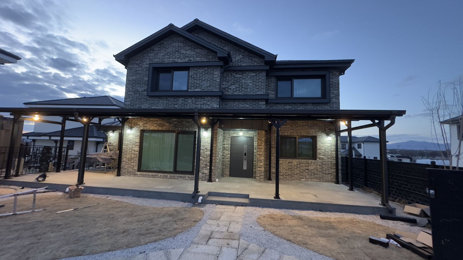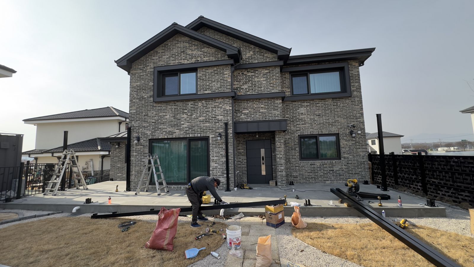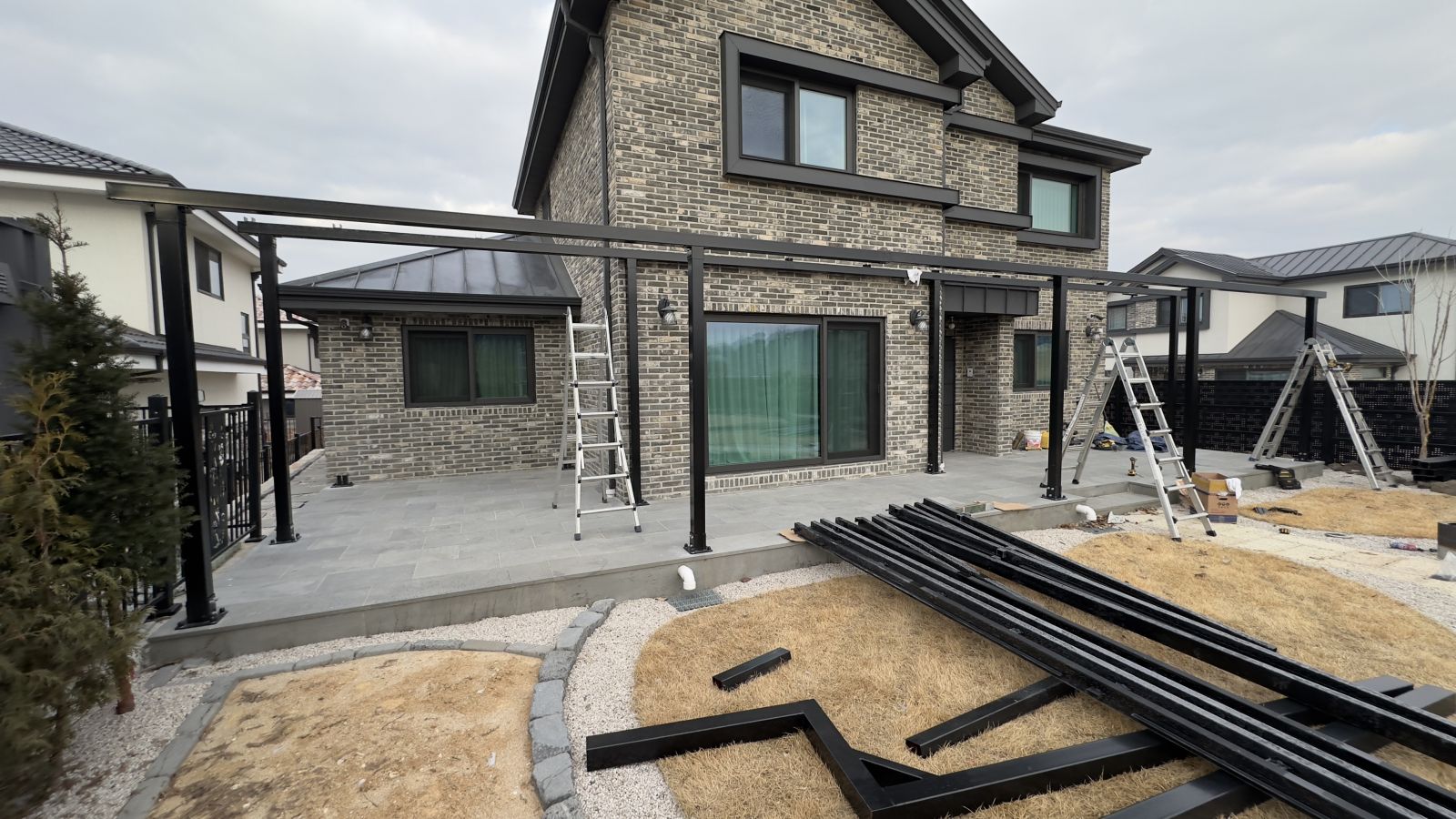 태양광인버터를 건물 외벽에 설치했습니다. 양면그라스 모듈은 일반모듈보다 생산이 높아 인버터를 설치하여 전기요금을 절약하실 수 있습니다. ![]() ![]() ![]() 태양광발전의 대표주자 "태양광캐노피"가 완공되었습니다. 처음 전원주택에 도착했을 때도 워낙에 넓고 깨끗하게 관리하고 계시고 웅장해서 '우와~~' 하고 탄성을 했는데요~ ![]() ![]() ![]() 태양광캐노피를 1층 전면부 전체에 블랙 색상으로 시공을 마치고나니 전원주택이 더 세련되고 멋있다는 말이 저절로 나왔습니다.